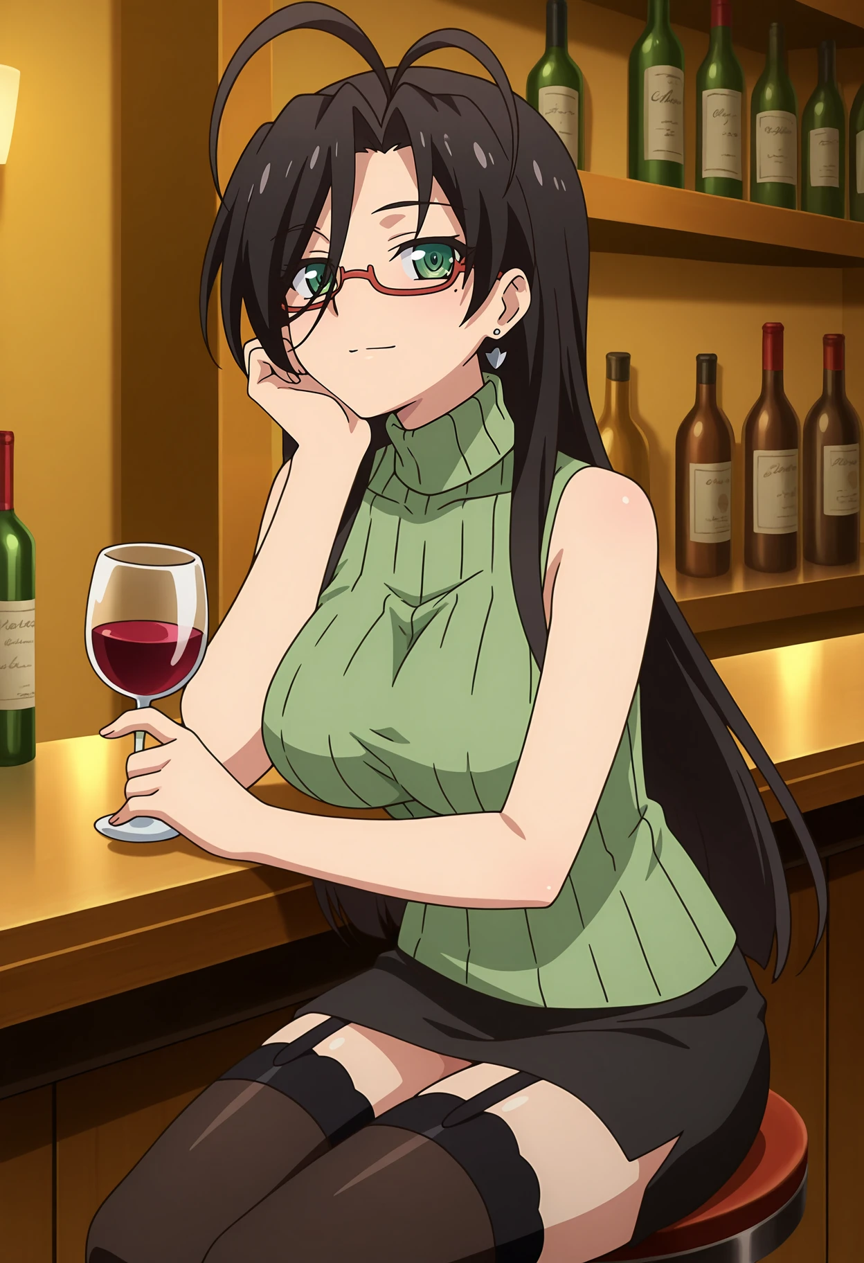 turtleneck sweater, ribbed sweater, sleeveless sweater, green sweater, pencil skirt, black skirt, garter straps, black thighhighs