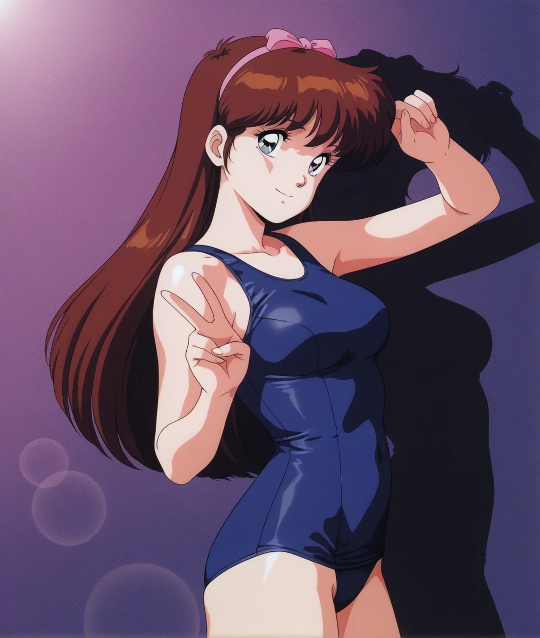 erika, long hair, brown hair, gray eyes, pink hairband, medium breasts, retro artstyle,