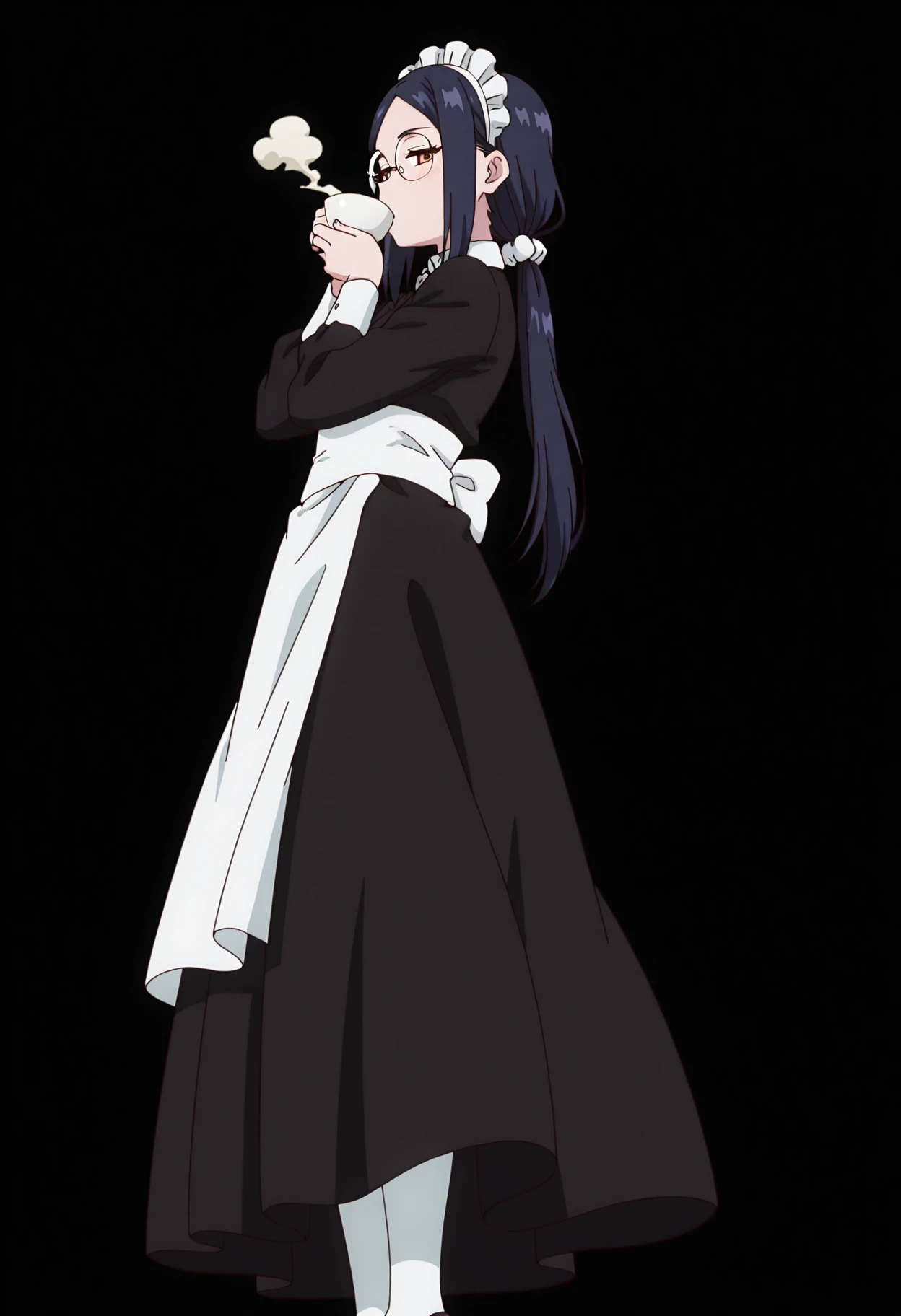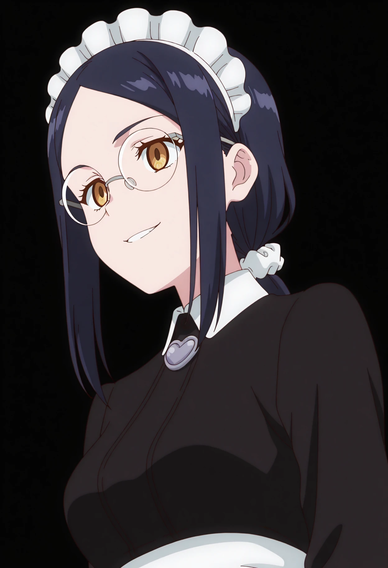 1girl, solo, head maid (kalm), long hair, glasses, black hair, blue hair, bangs, sidelocks, brown eyes, yellow eyes, ponytail, white scrunchie