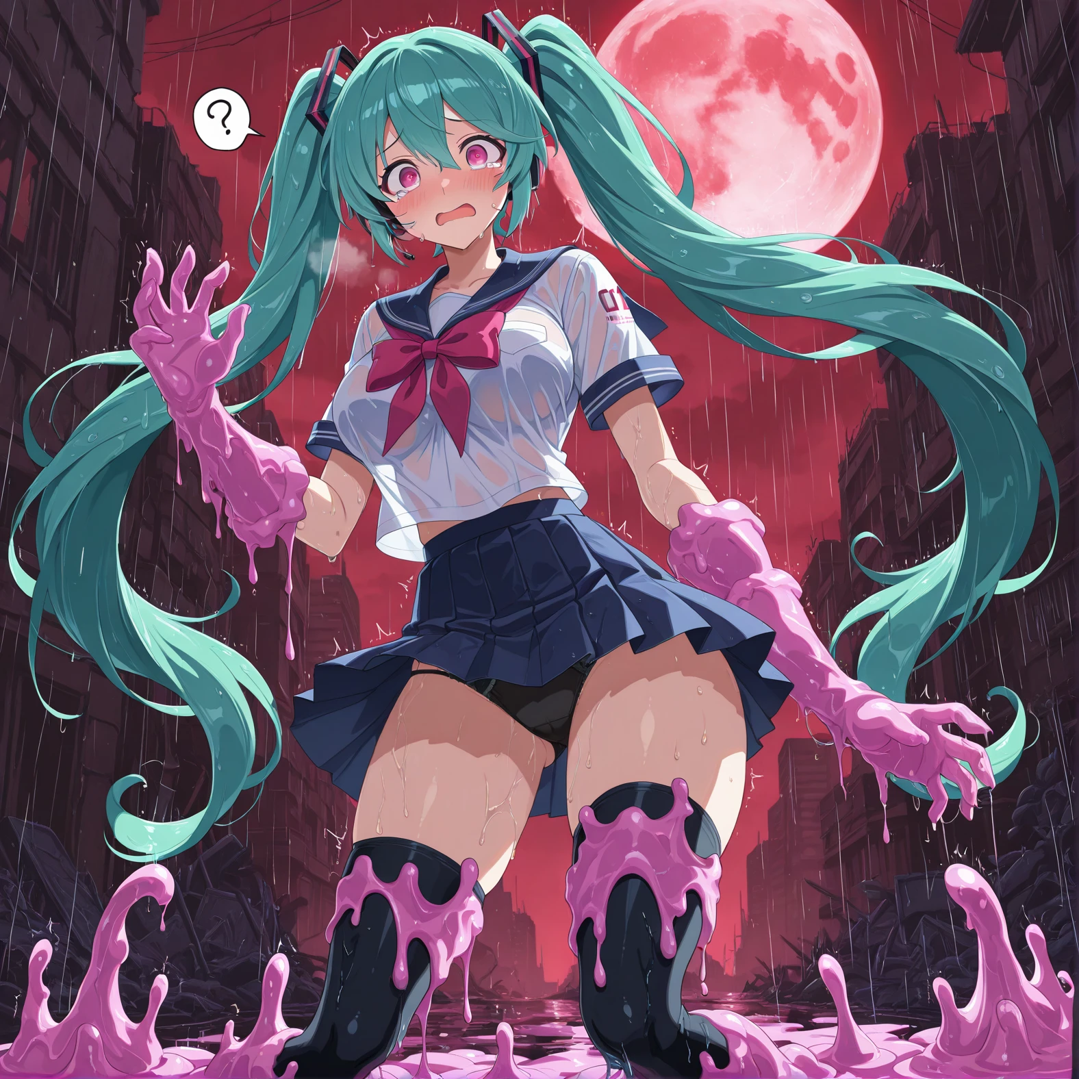 RubberDrone_MGR, sweat, spoken question mark, slime_(substance), slime on thighhighs, slime gloves, slime on body, melting hands, melting clothes, covered with slime, breath3,The viscous slime-like liquid solidified, forming a tight, skin-like latex garment with growing meat stick: