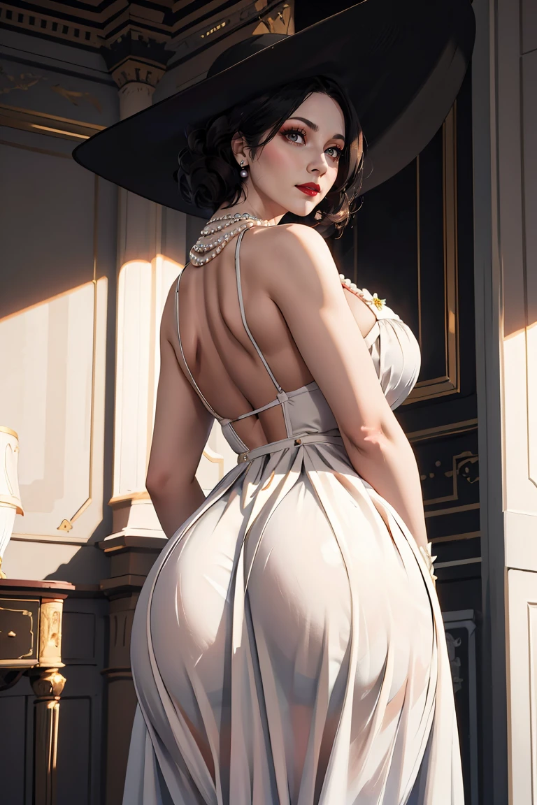 <outfit 1> black sun hat, white dress, pearl necklace, black flower