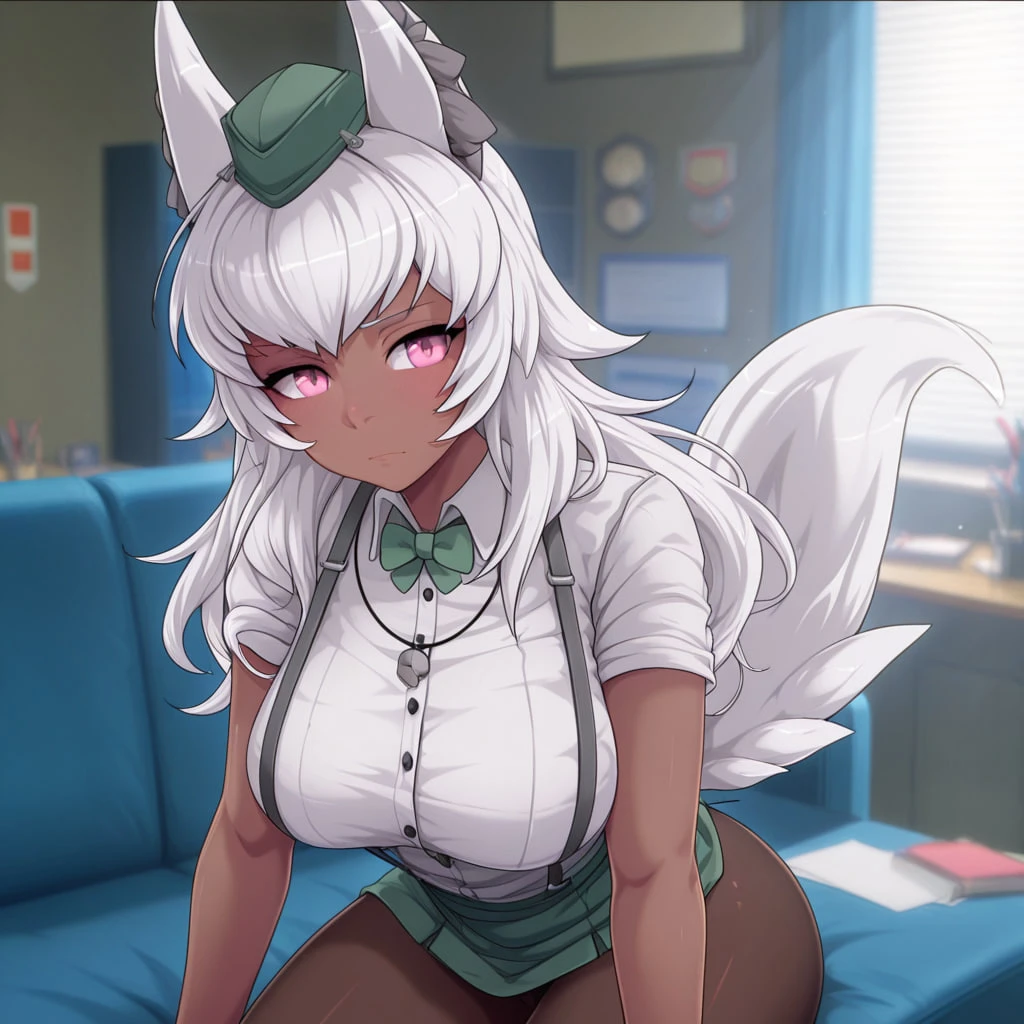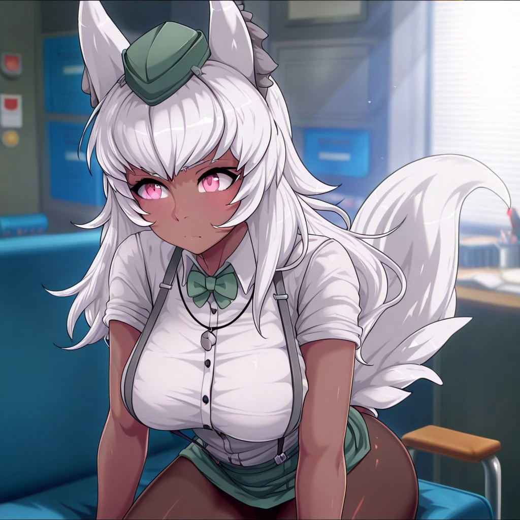 1girl, solo, dog girl, dark-skinned female, large breasts, pink eyes, white hair, long hair, animal ears, dog tail,