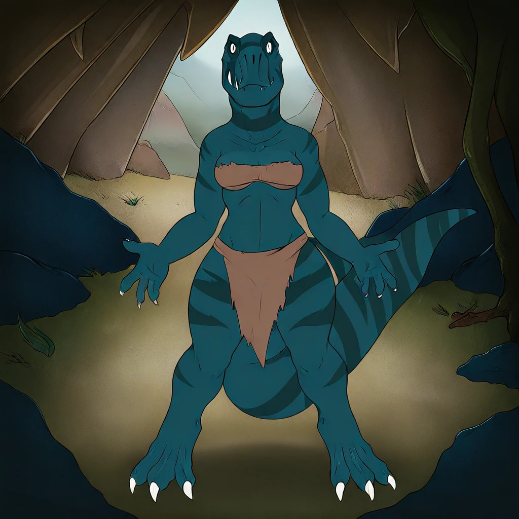 F4ng(character), anthro, dinosaur, T rex, female, 1fang, stripes, blue body,