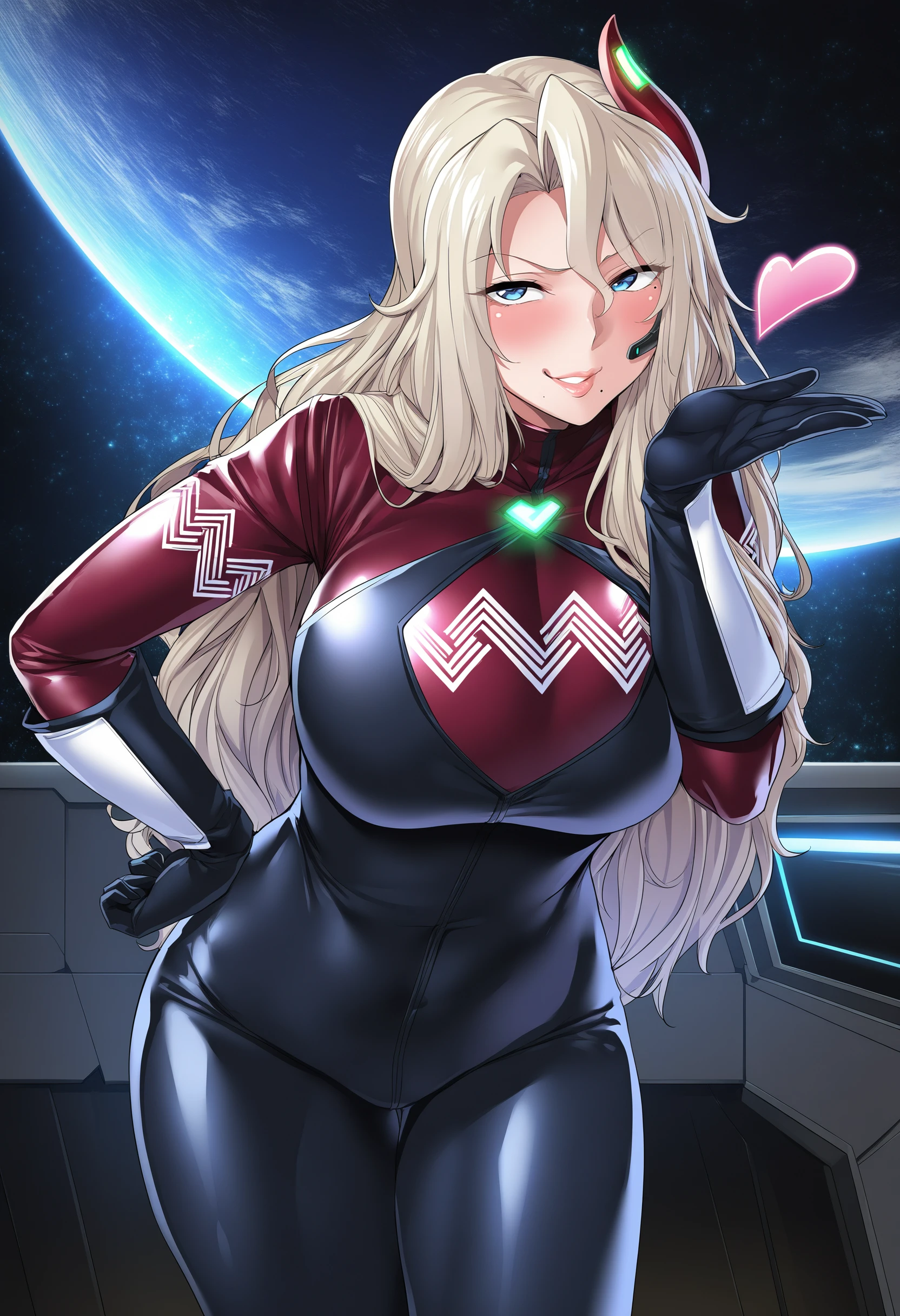 blonde hair, long hair, lips, blue eyes, mole under eye, mole under mouth, headset,