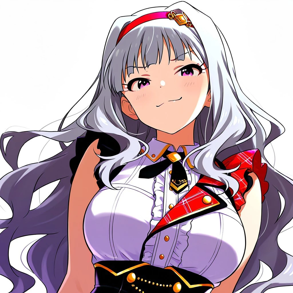 silver hair,very long hair,hairband,red band,bangs,purple eyes,wavy hair,large breasts
