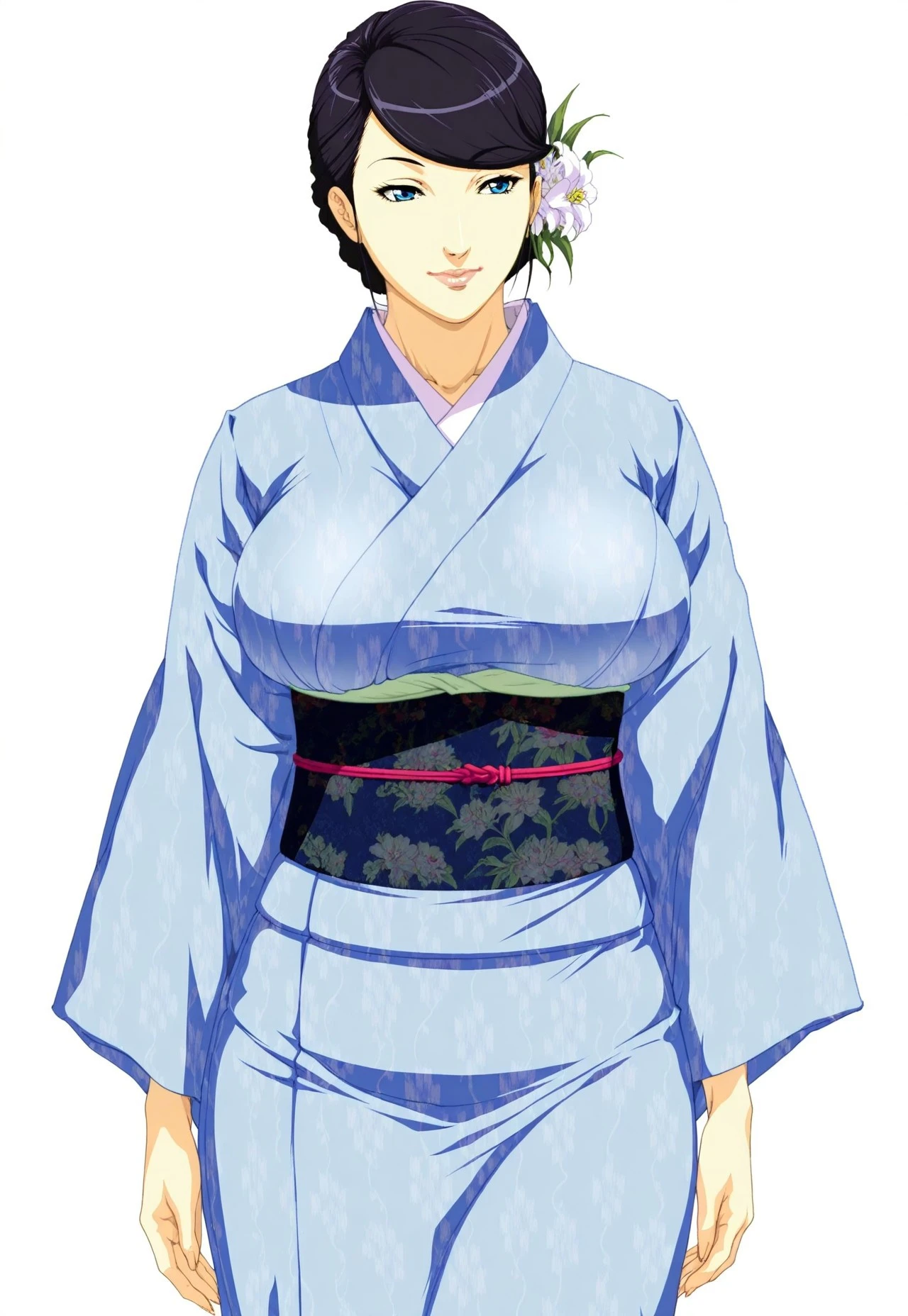 yuri aiba, bangs, blue eyes, large breasts, black hair, hair ornament, flower, hair flower, swept bangs, mature female, lips,