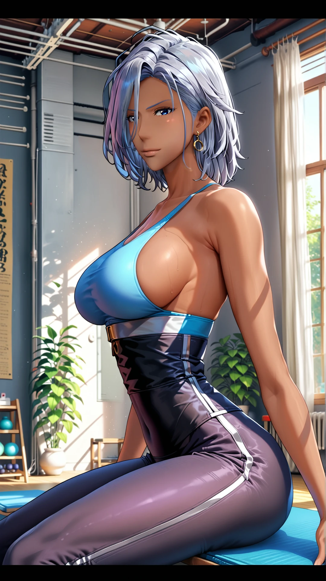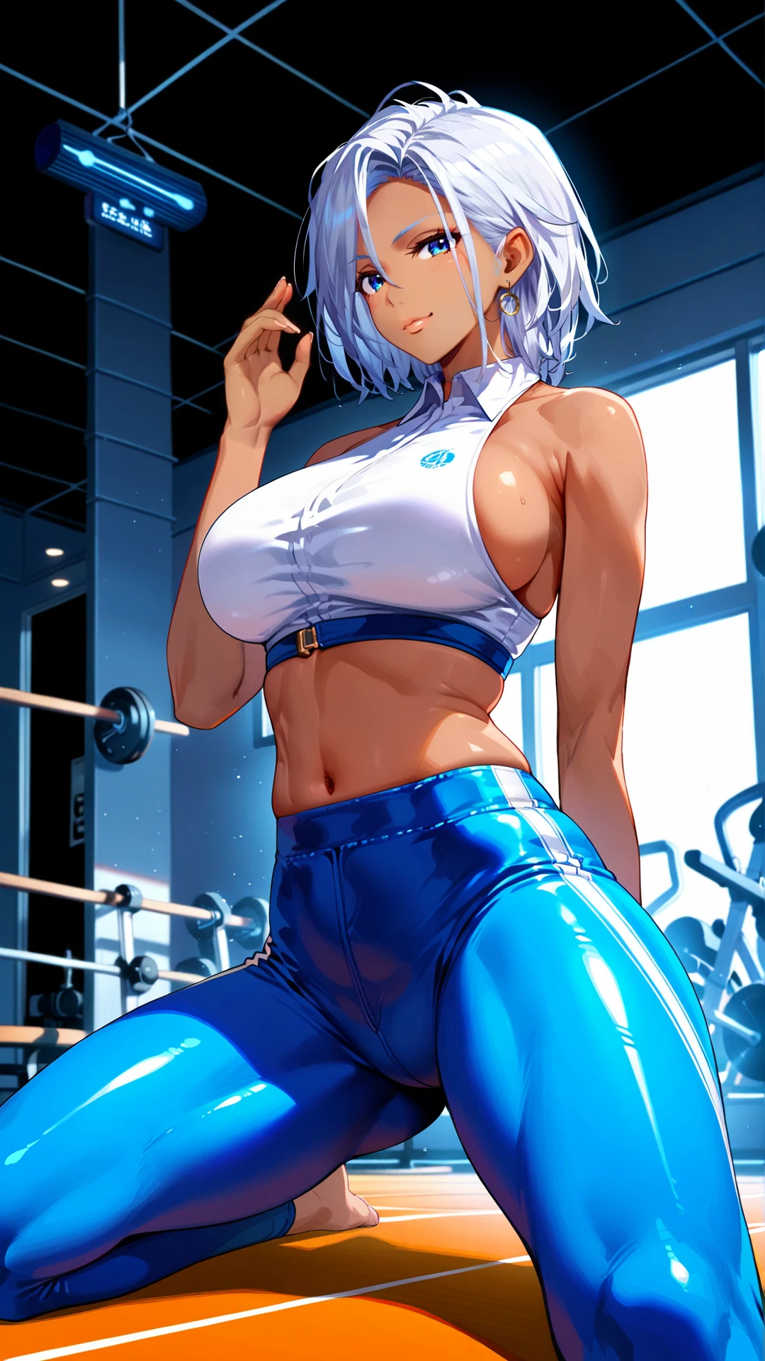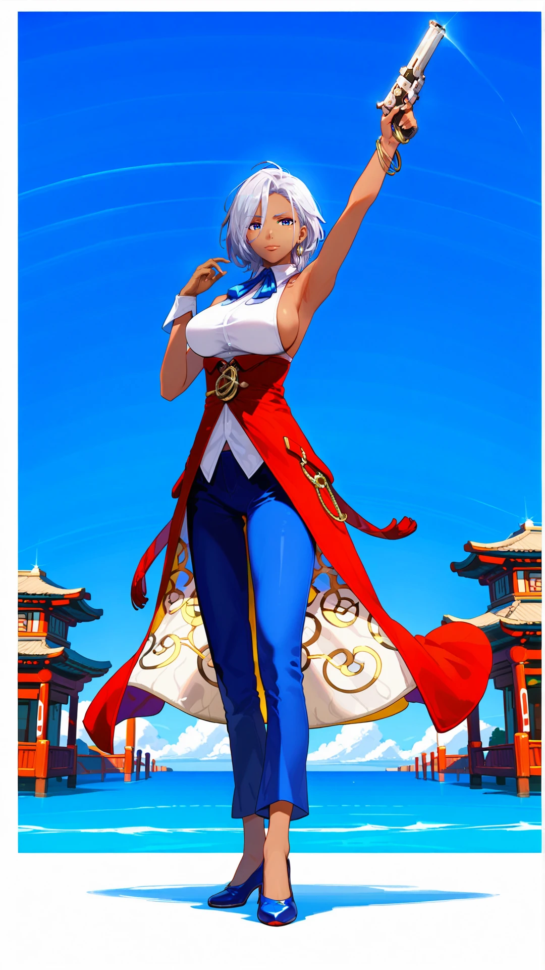 1woman, tall, dark tanned skin, sideboob, dark silver hair, deep blue eyes, white dress with open back and bibs, blue ribbon, red long skirt, blue dress pants, light blue shoes, a pair of gold bracelets on her left arm and a blue and white bracelet on her right wrist,