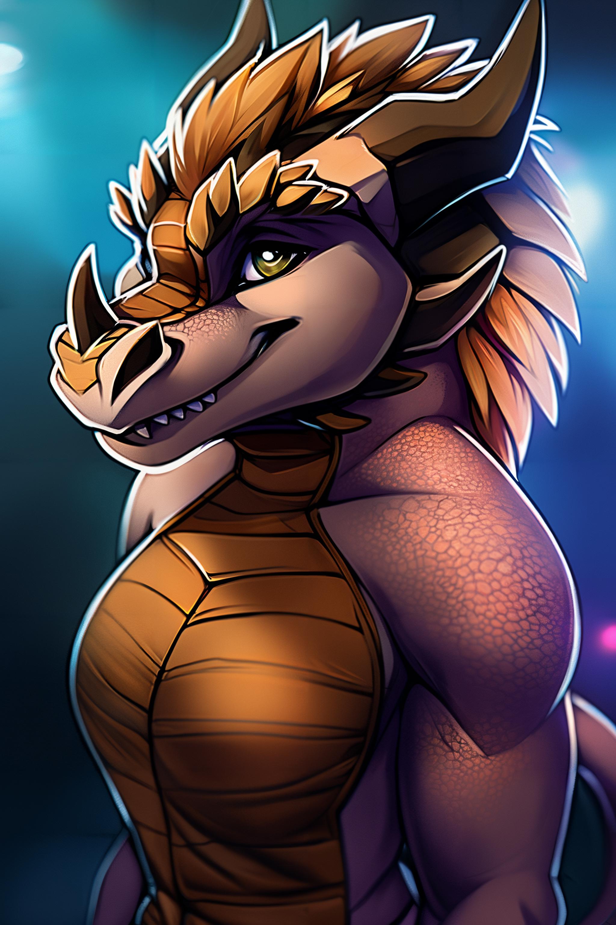 scalie, male, anthro, dragon, tail, hair plates, nose horn, horns, red eyes