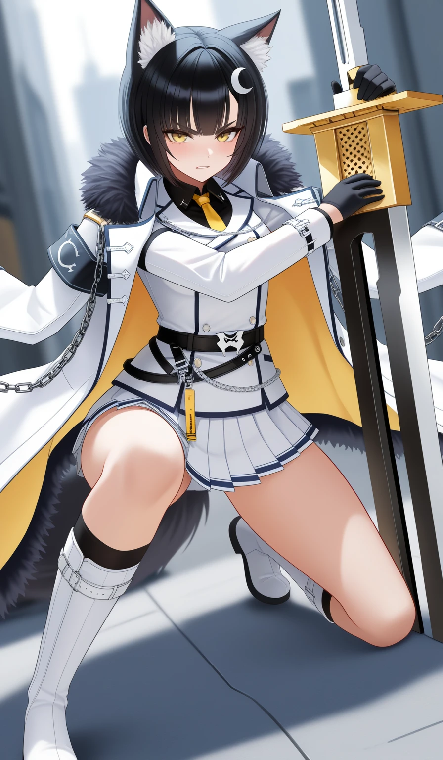 Trigger words A : short hair, black hair, wolf ears, thick eyebrows, crescent hair ornament, yellow eyes, black shirt, collared shirt, wing collar, yellow necktie, white jacket, white coat, long sleeves, fur-trimmed coat, coat on shoulders, white skirt, pleated skirt, miniskirt, white boots, knee boots, black socks, kneehighs, black gloves, floating clothes