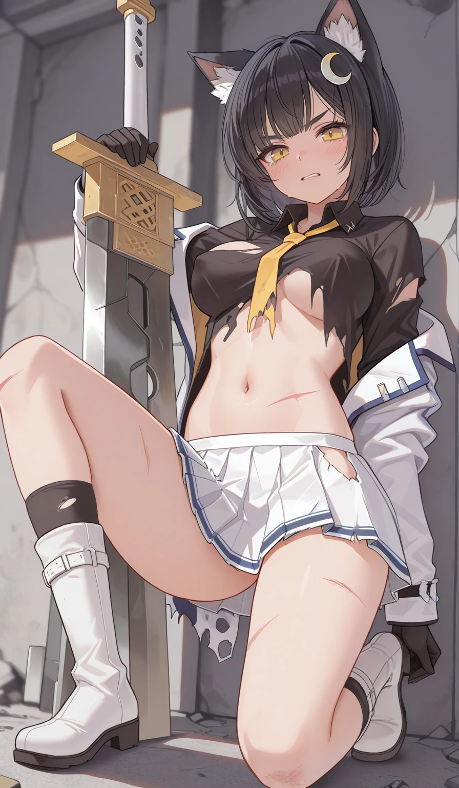 Trigger words C: short hair, black hair, wolf ears, thick eyebrows, crescent hair ornament, yellow eyes, black shirt, collared shirt, yellow necktie, long sleeves, white jacket, off shoulder, pleated skirt, white skirt, miniskirt, kneehighs, black socks, white boots, knee boots, open clothes, torn clothes, torn shirt, torn skirt, navel, stomach, covered nipples, no bra, thighs, black gloves, scar, injury, blush, tears