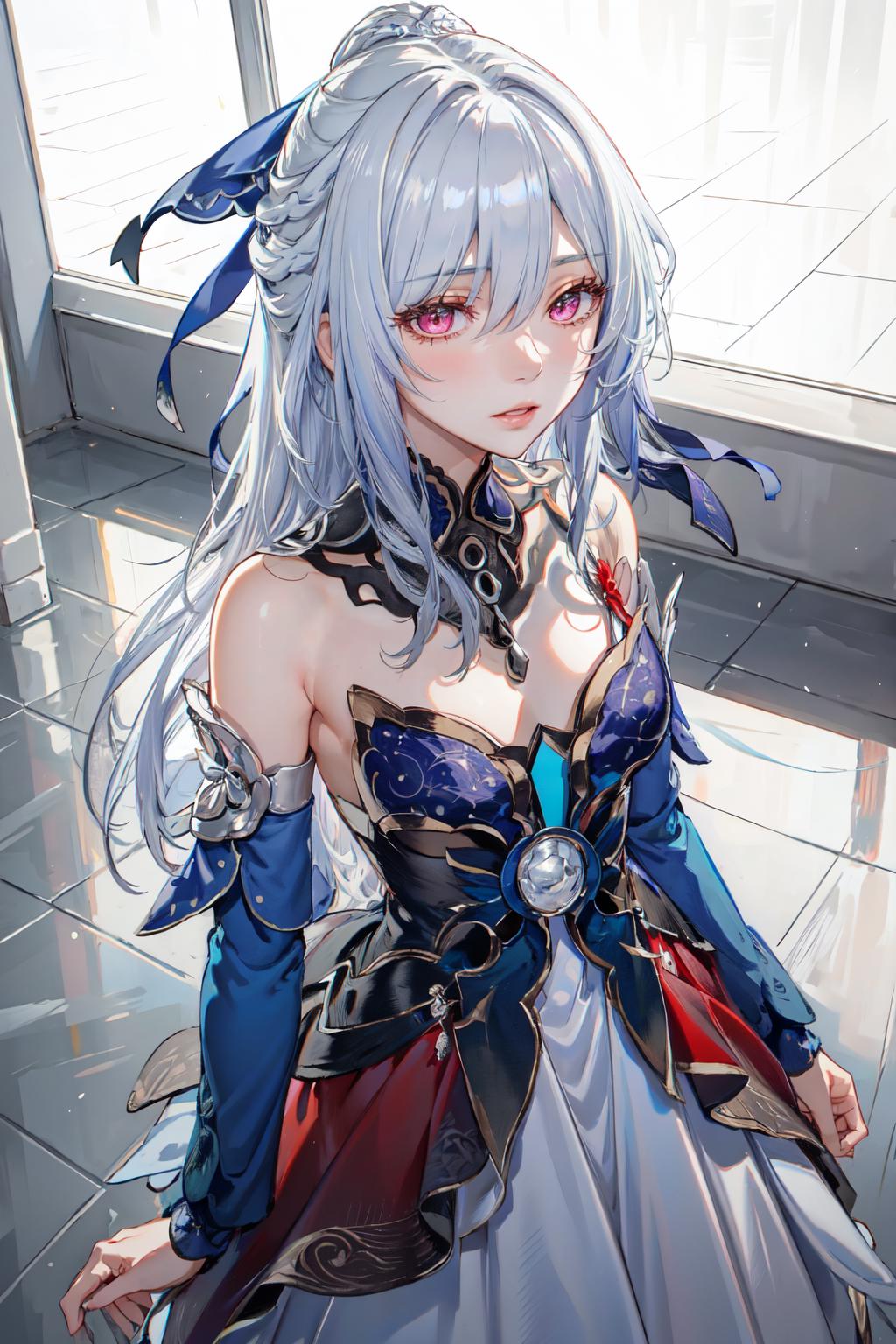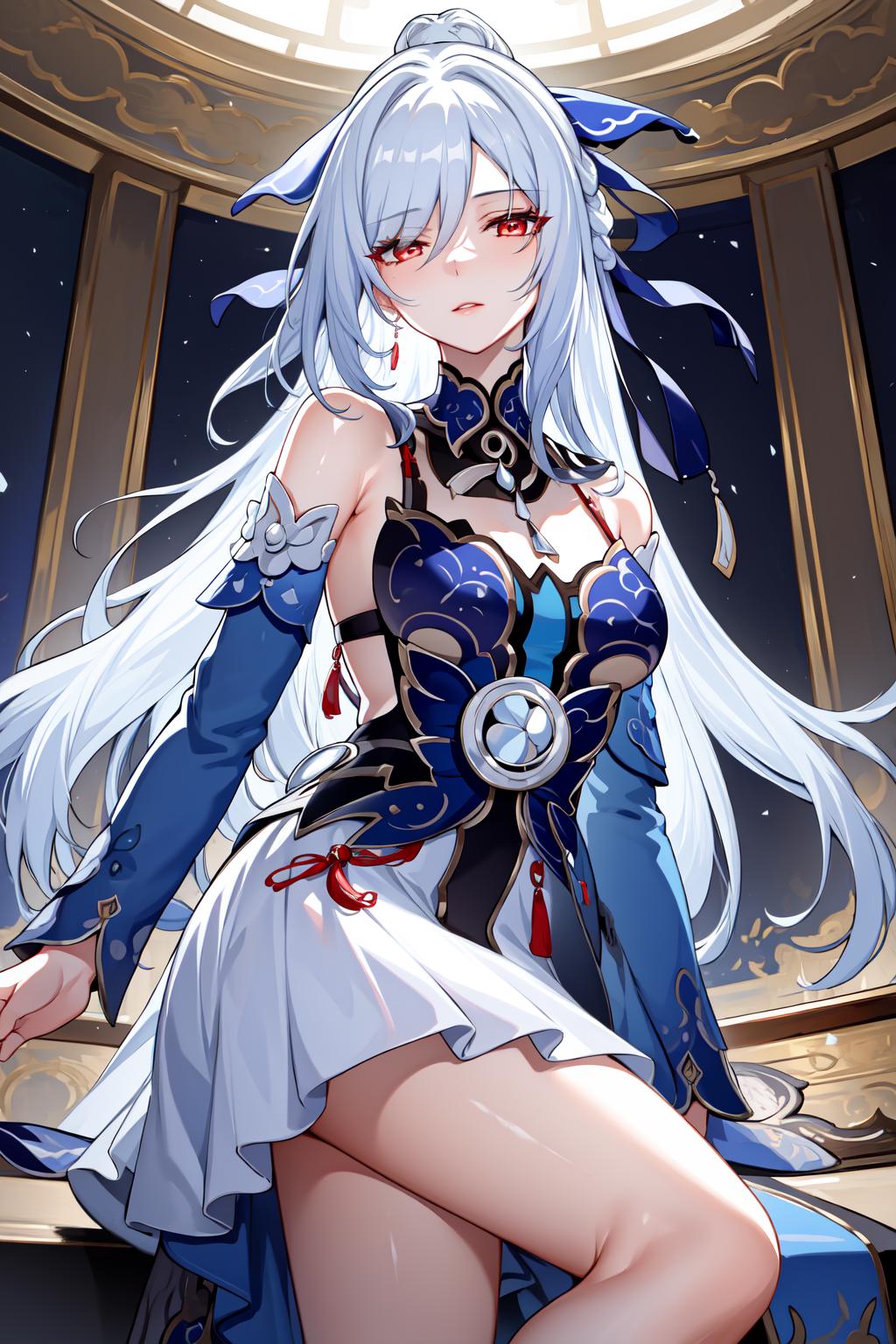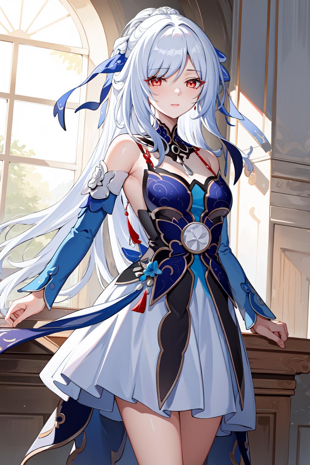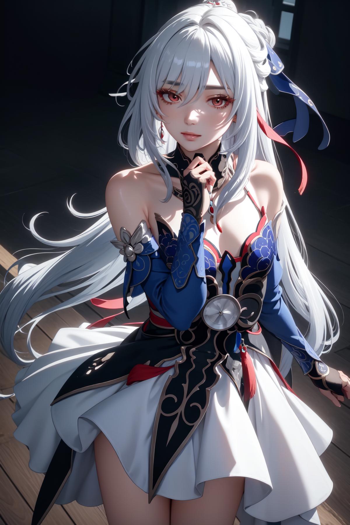 jingliu, 1girl, long hair, bangs, dress, bare shoulders, white hair, hair ornament, solo