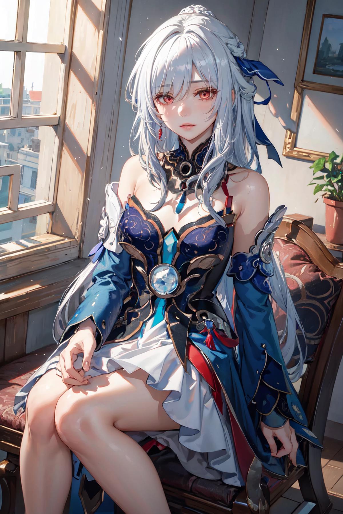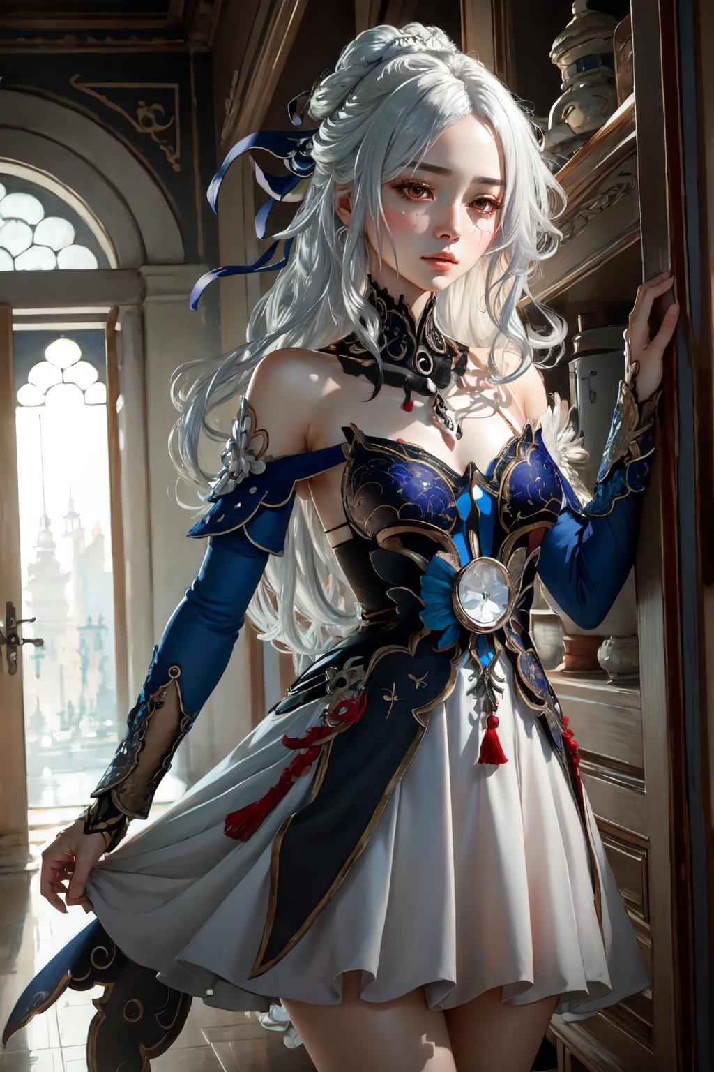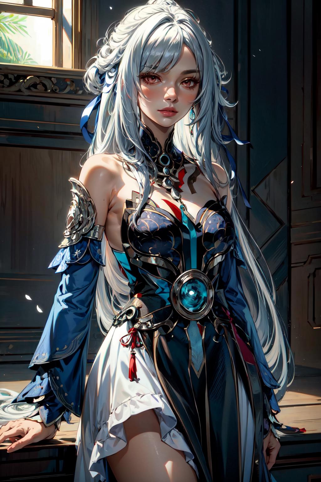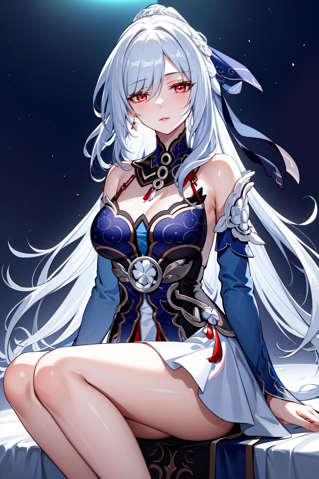 jingliu, 1girl, long hair, bangs, dress, bare shoulders, white hair, hair ornament, solo