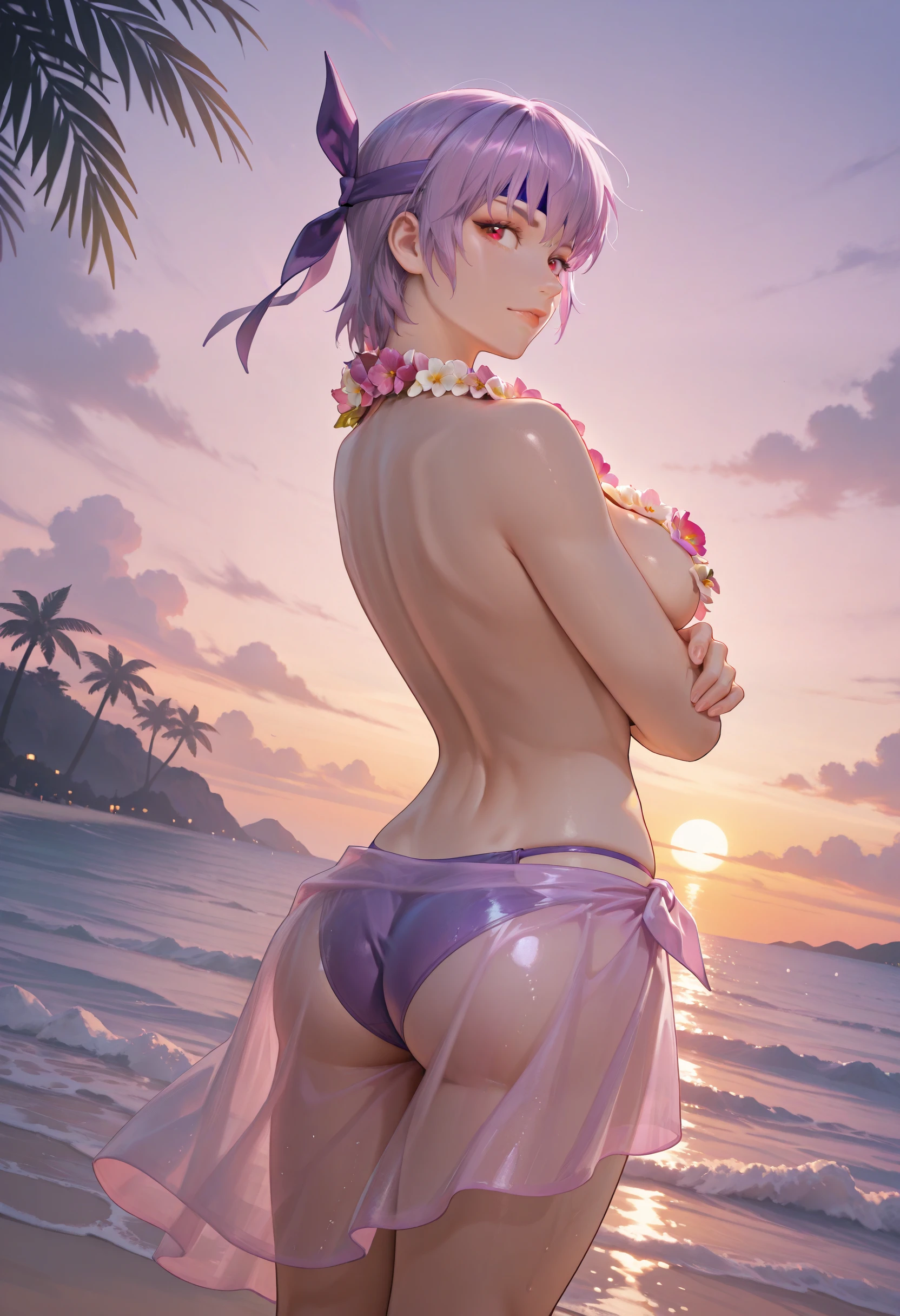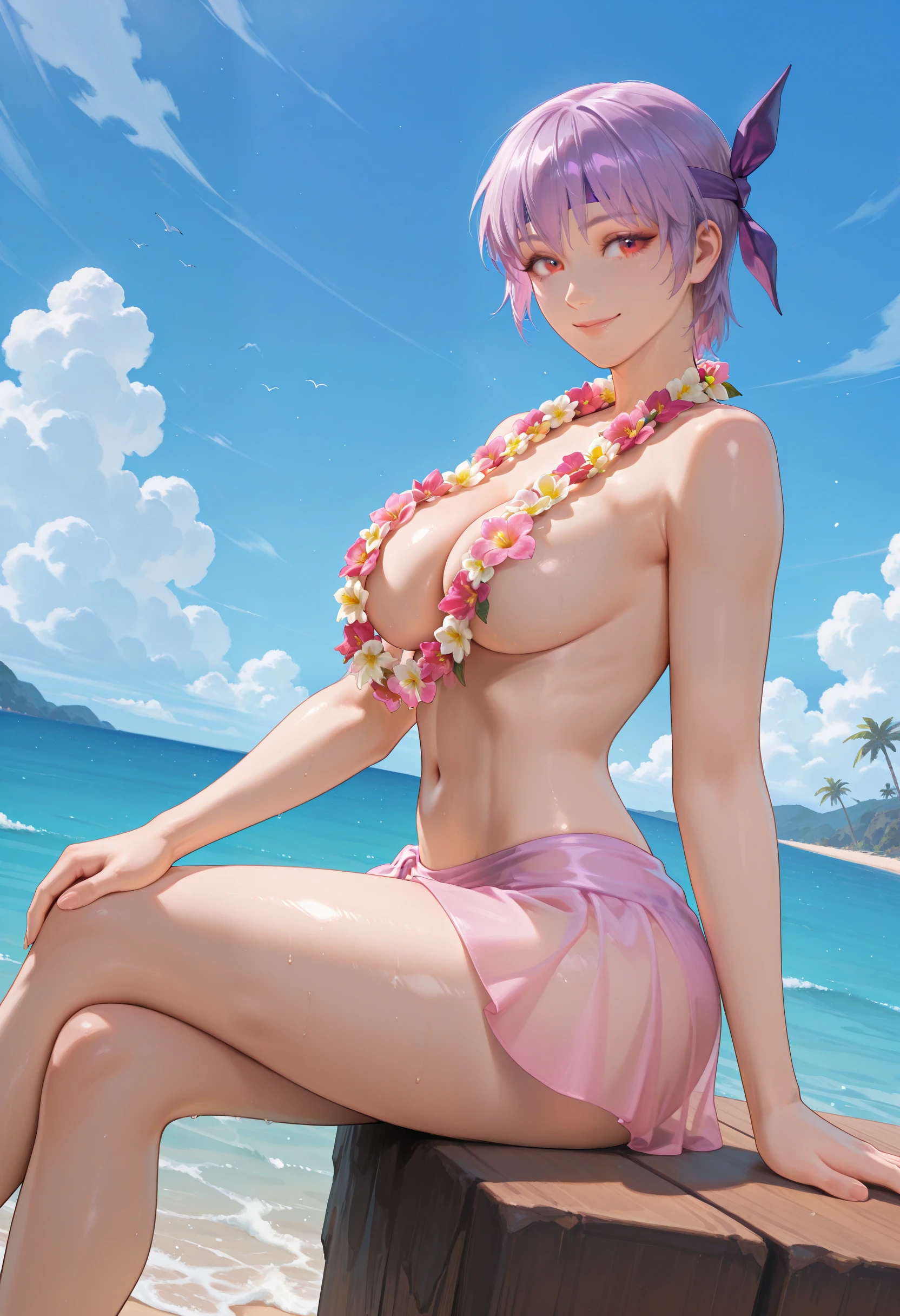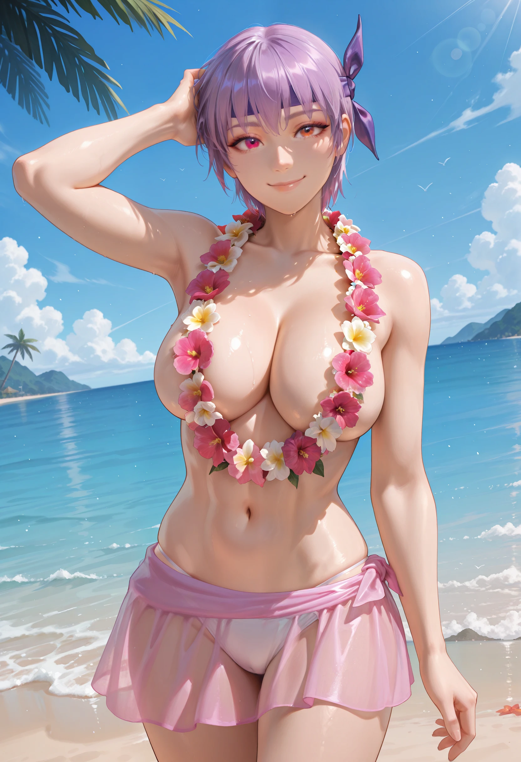 LilacBikini_Doaxvv,flower necklace,lei,topless,cleavage,bikini skirt,sarong,see-through,bikini bottom