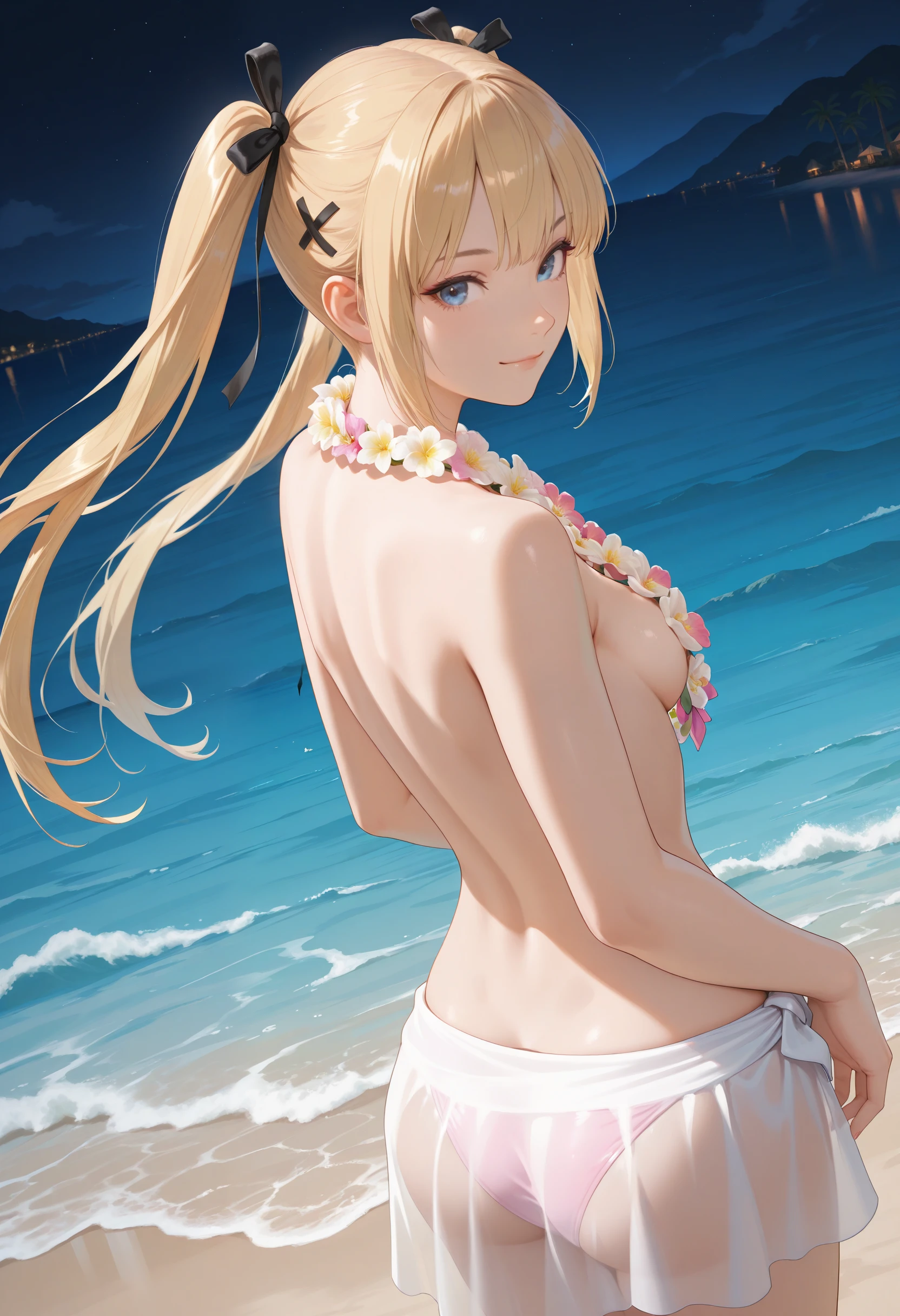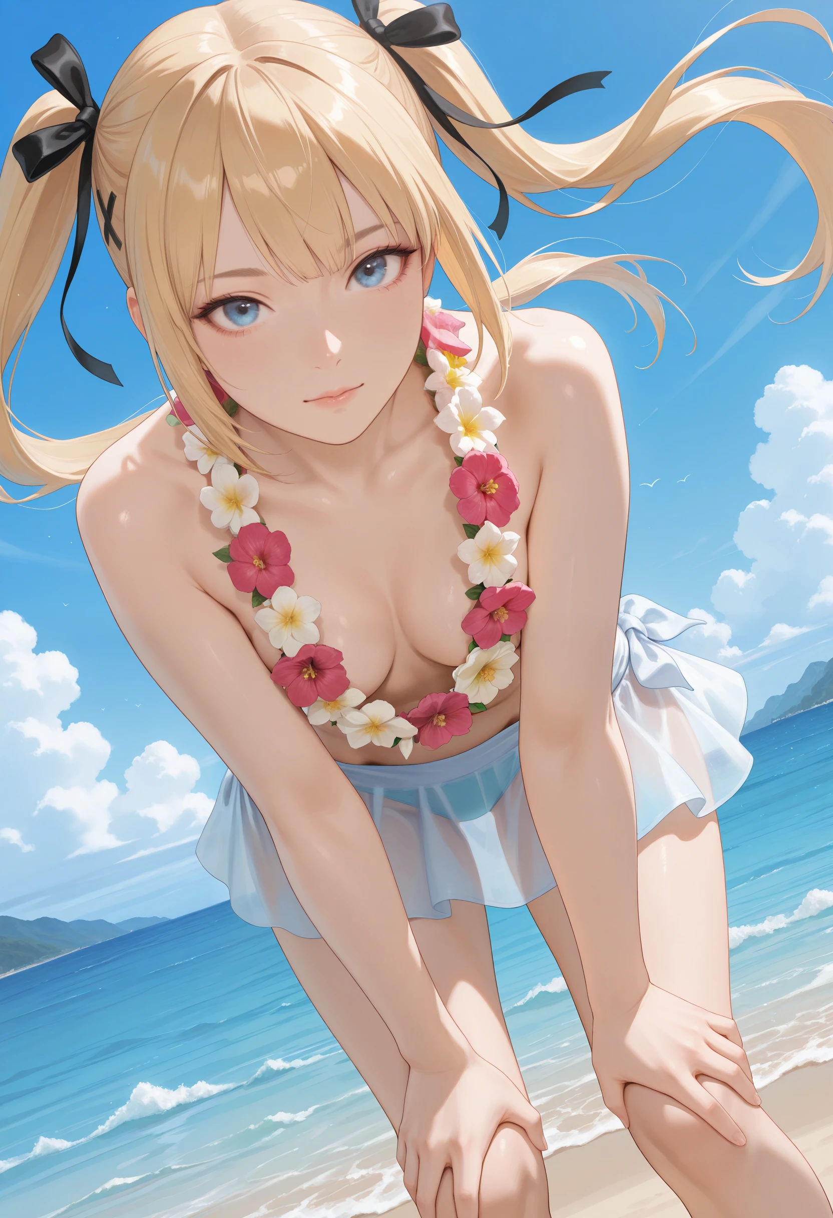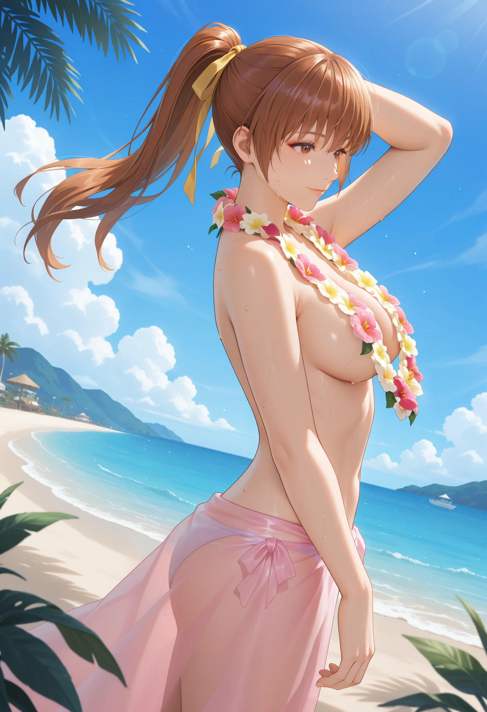 LilacBikini_Doaxvv,flower necklace,lei,topless,cleavage,bikini skirt,sarong,see-through,bikini bottom