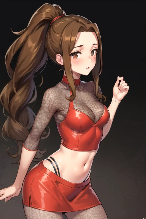 WillowHurare, 1girl, solo, long hair, miniskirt, brown hair, navel, cleavage, brown eyes, medium breasts, high ponytail, midriff, red crop top, fishnet bodysuit, red skirt