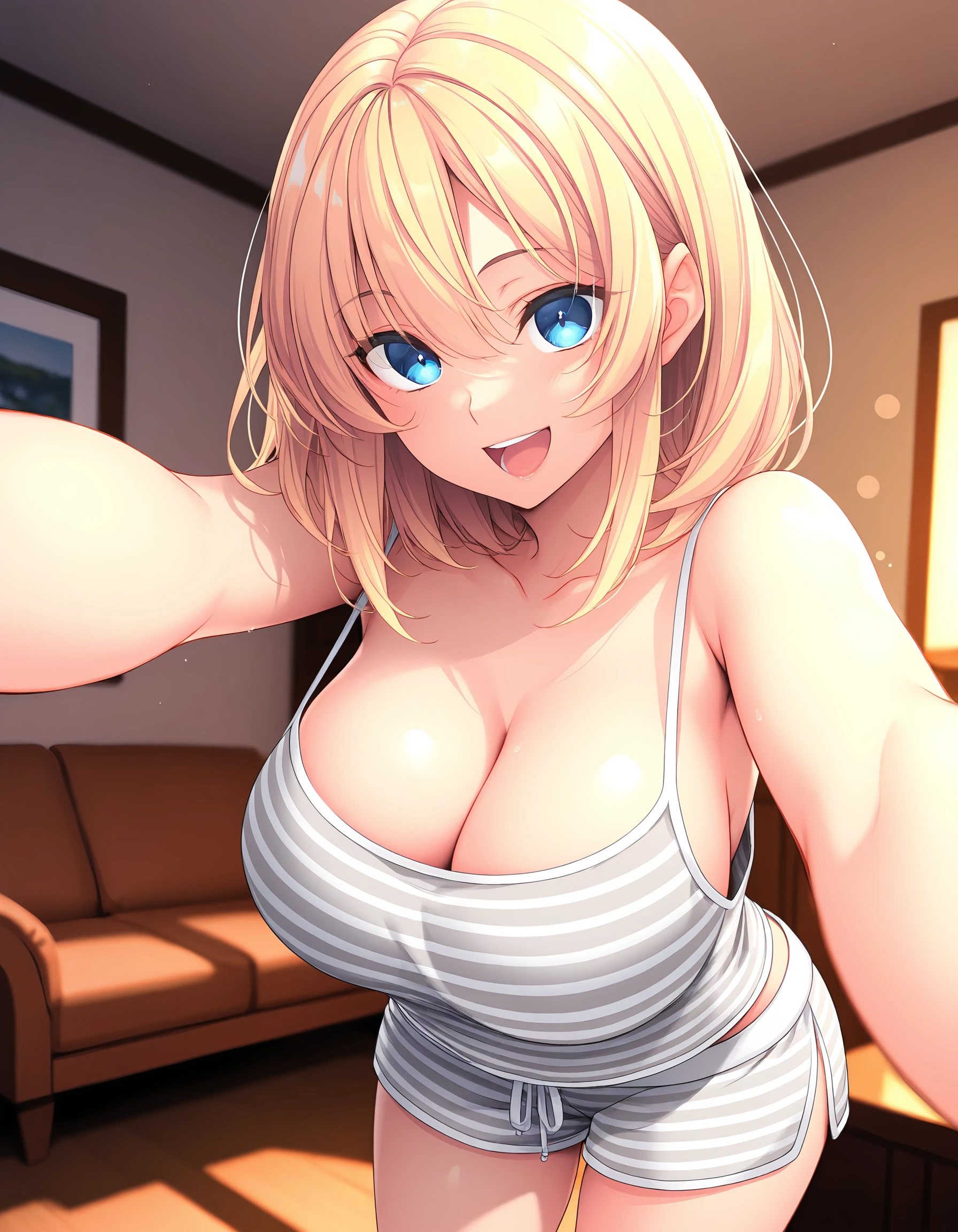 outfit03, pajamas, striped pajamas, no bra, cleavage, camisole, shorts, short shorts, bow shorts, side slit shorts,