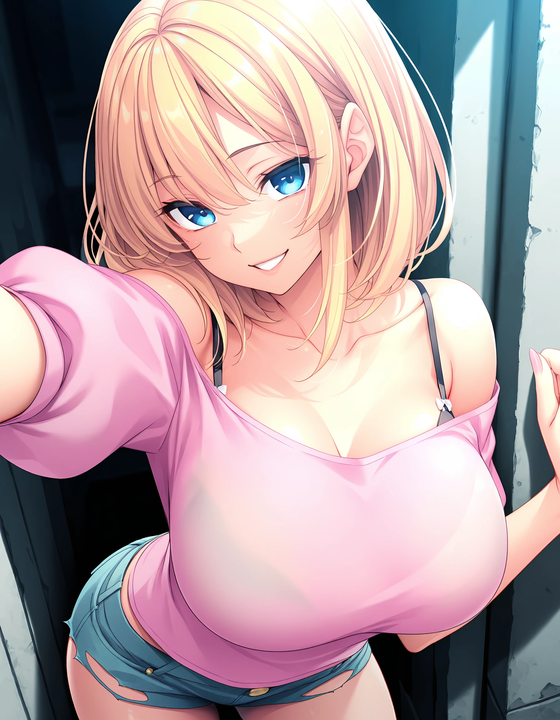 outfit02, shirt, pink shirt, off shoulders shirt, bra strap, short sleeves, puffy sleeves, shorts, short shorts, blue short, denim shorts, torn shorts, sandals, white sandals,