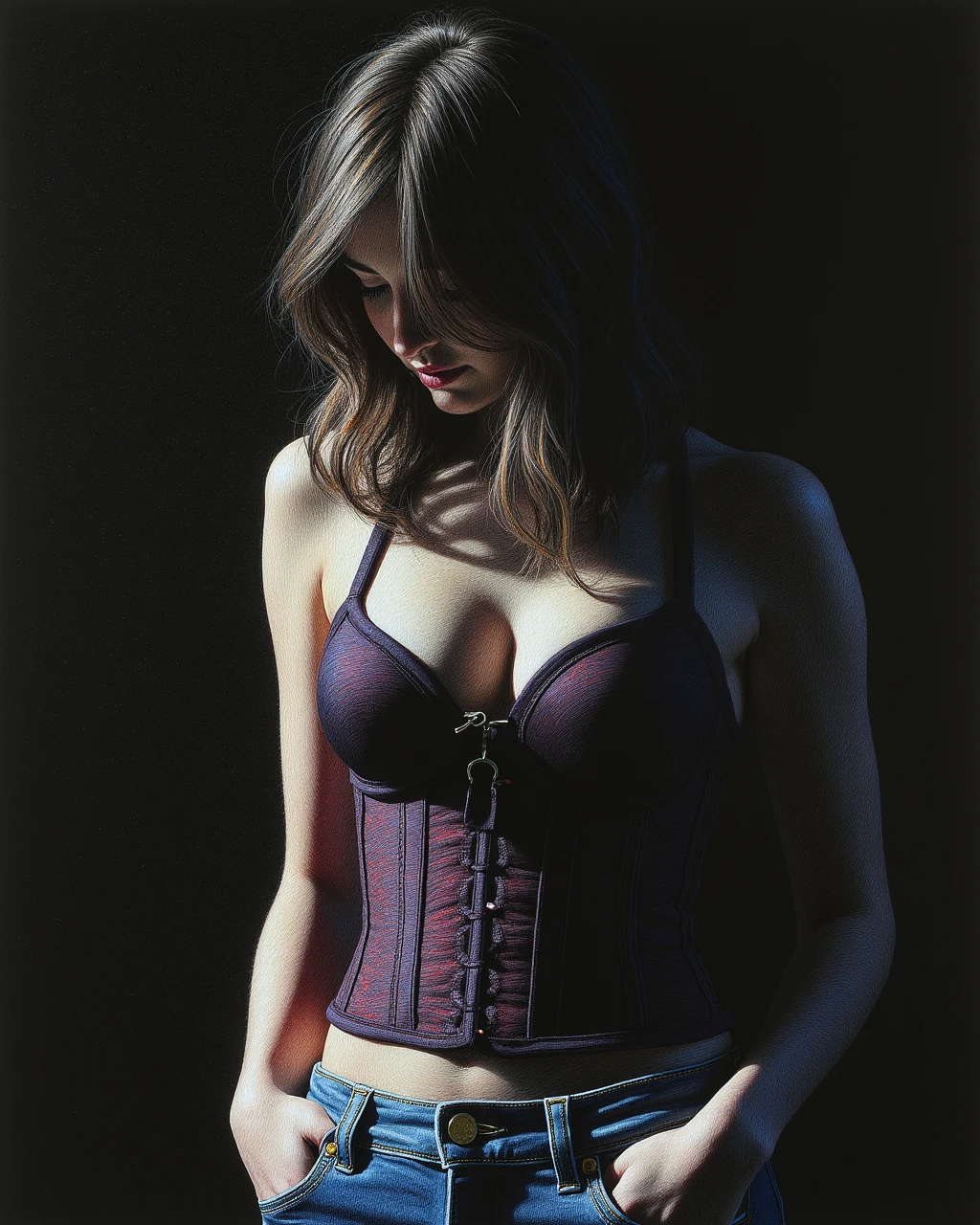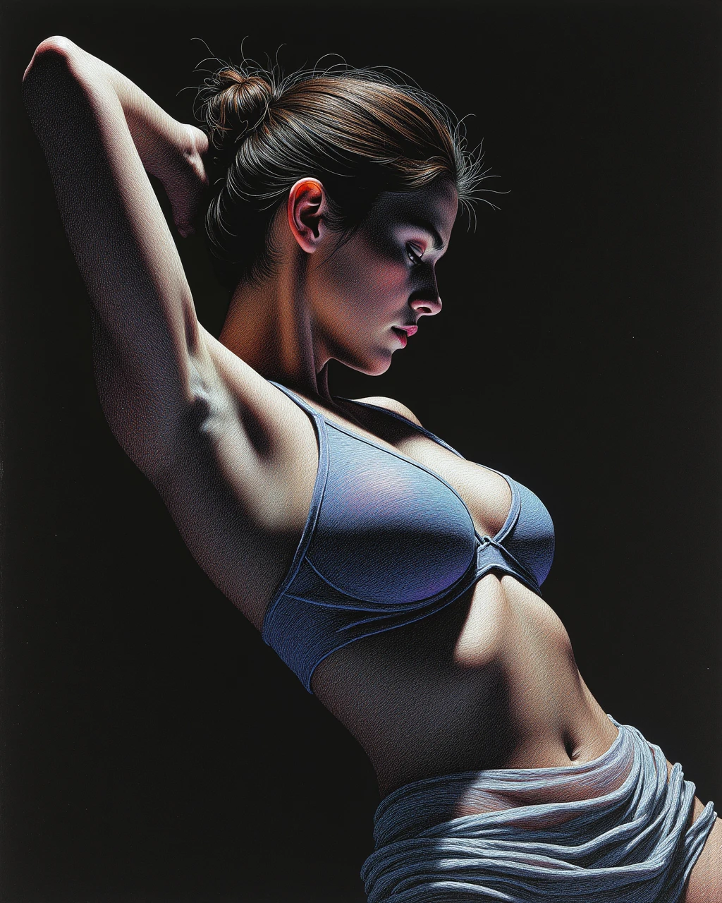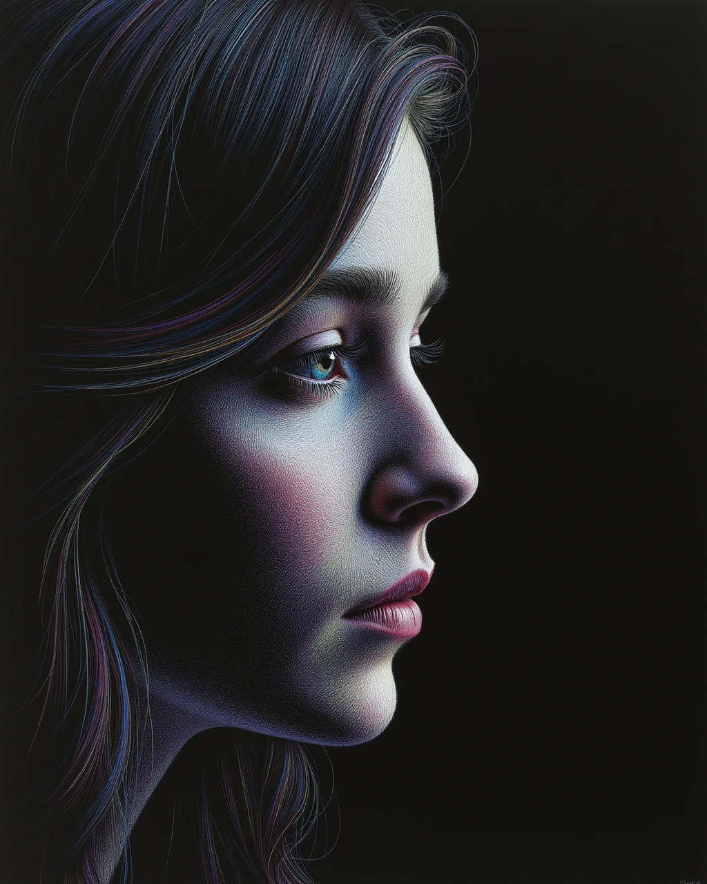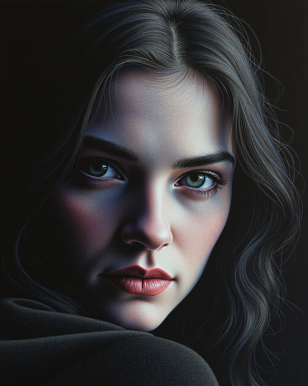prism4, portrait of a woman, dreamy, waist up portrait, draped in transparent fabric, deep shadows, vibrant colors against pitch blackprism4, a vintage camera and a burning candle on a table, low key lighting, deep shadows, cross-hatching detailsCheck meta on sample pics for prompting ideas!