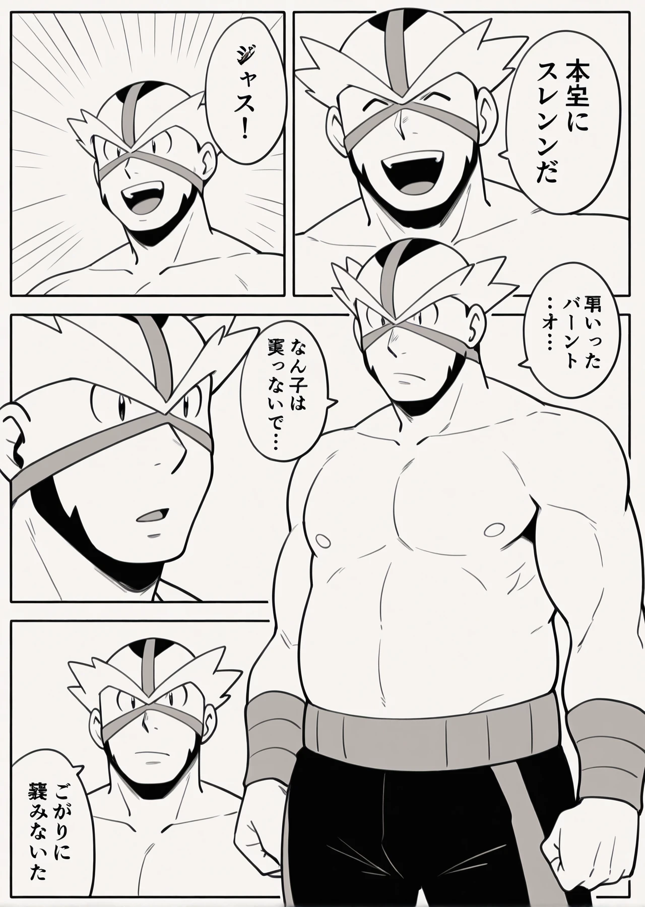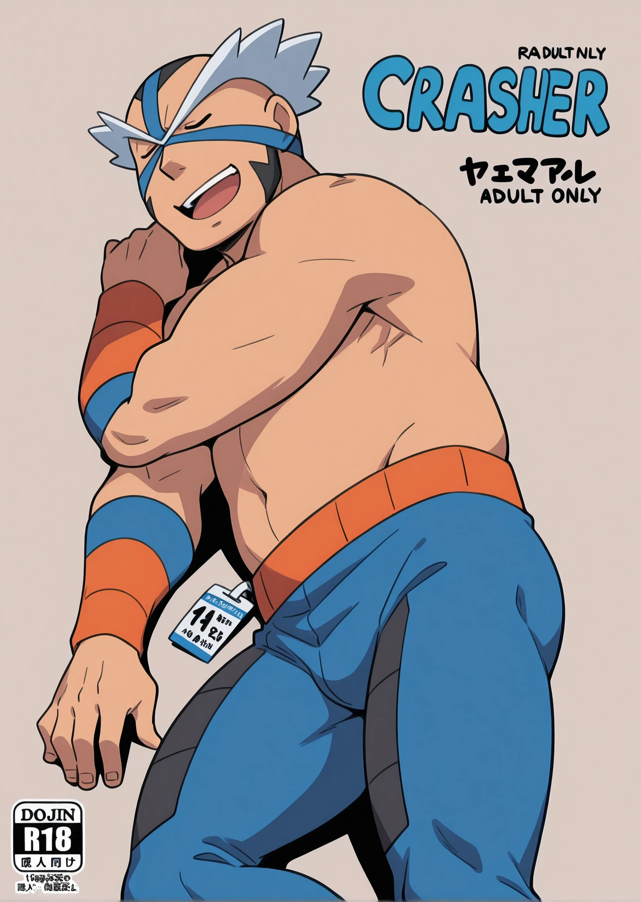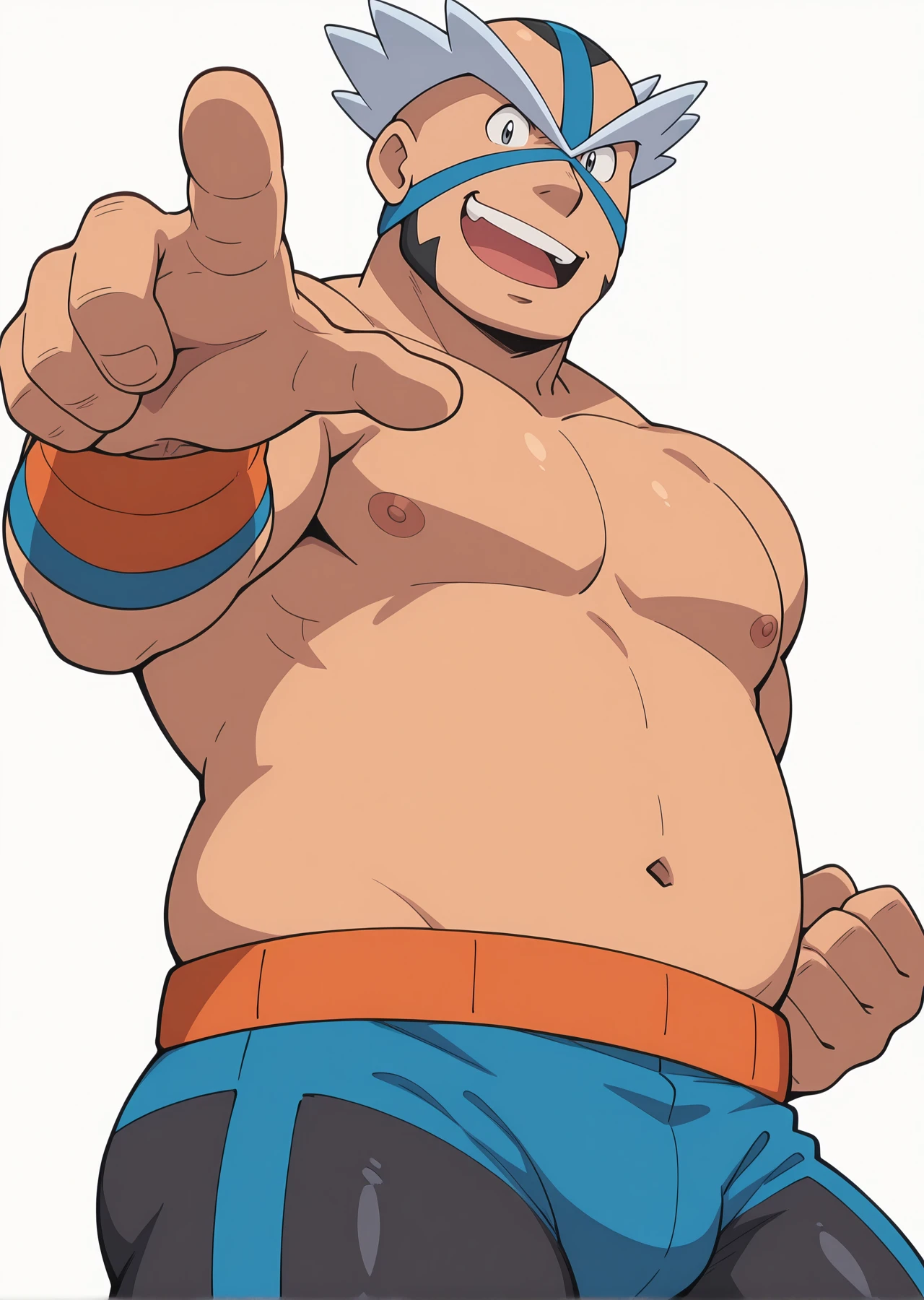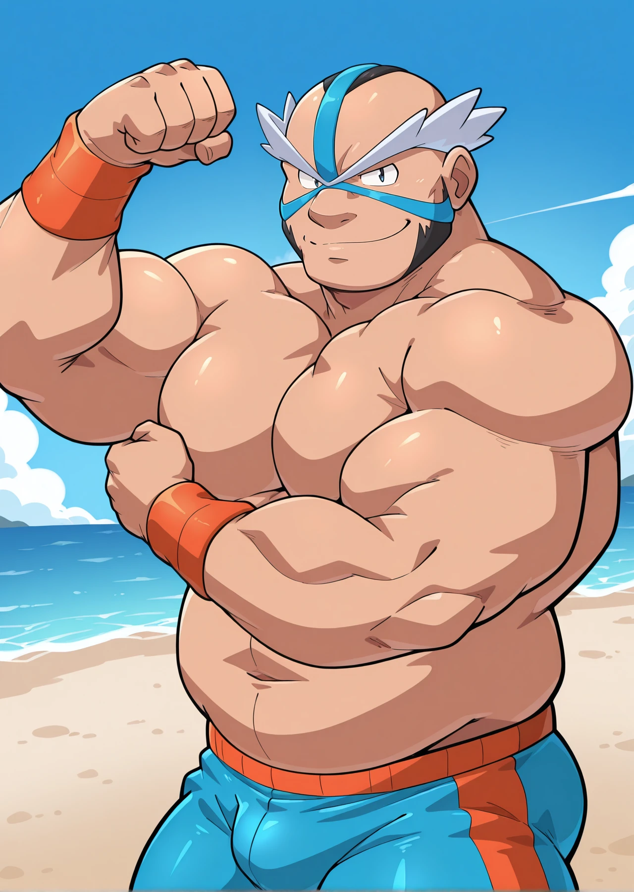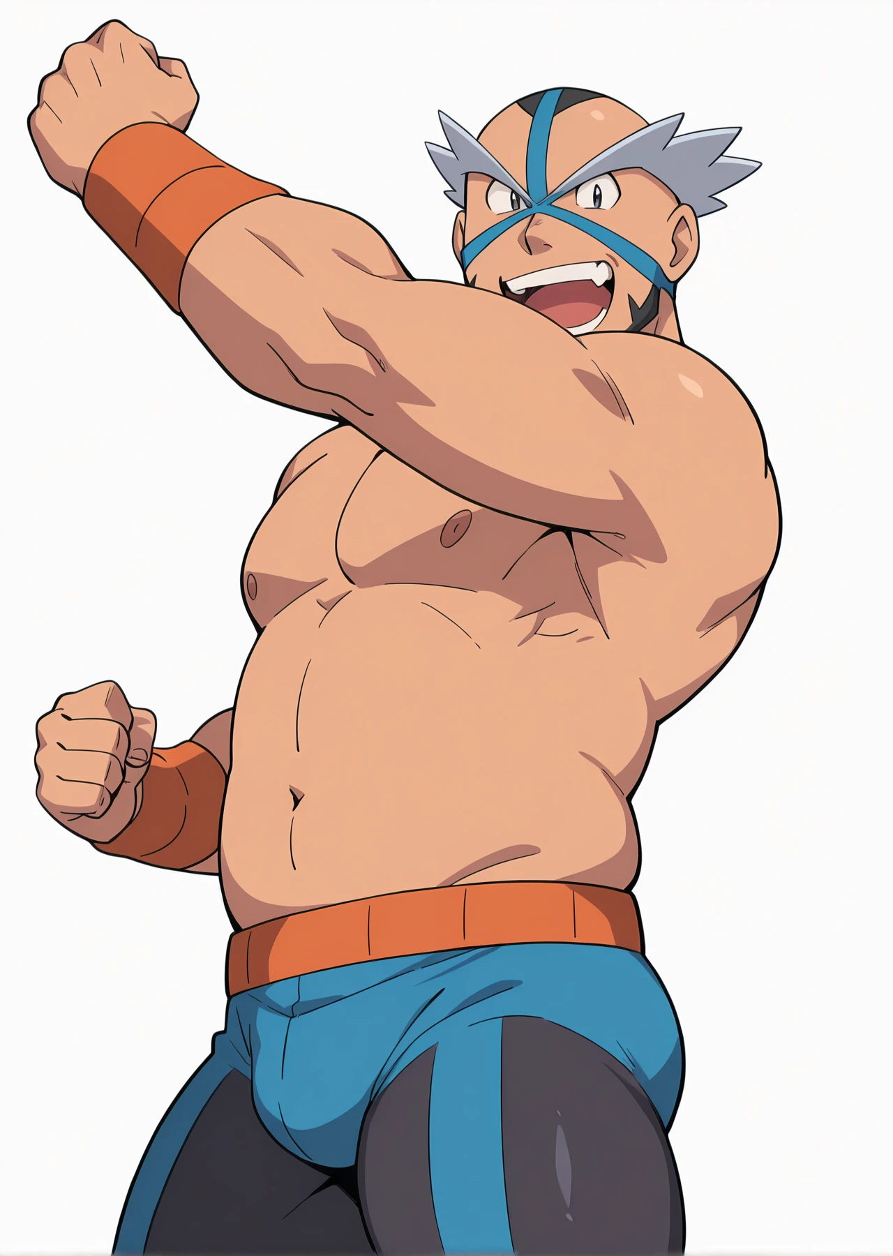 muscular, bara, chubby, 1boy, mature male, male focus, solo, tight pants, mask, hair wing, black hair, short hair, bald, facial hair, topless, blue and orange wristband,