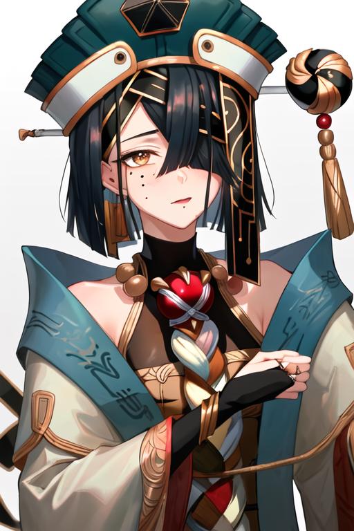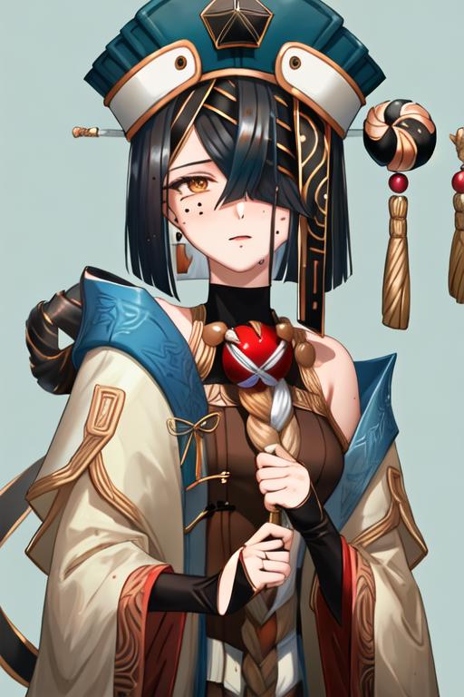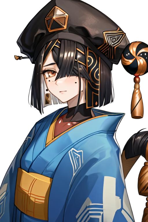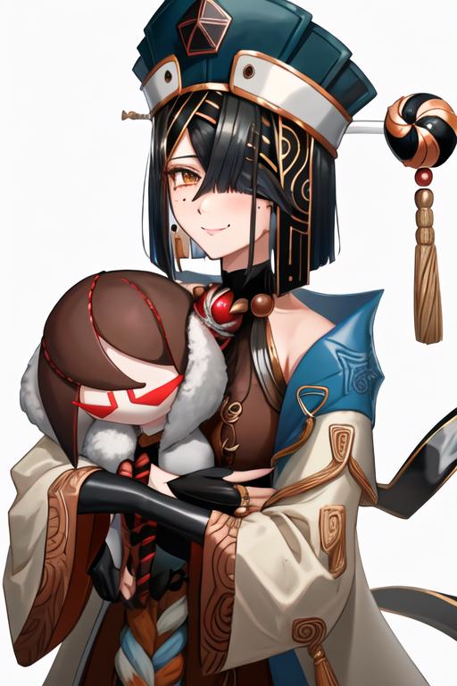 black_hair, hair_over_one_eye, mole, mole_under_eye, small_breasts, breasts, doll, hair_ornament, hat, blue_headwear, short_hair, hair_stick, character_doll, brown_eyes, tassel, straight_hair, medium_hair, hair_between_eyes, gem, bridal_gauntlets