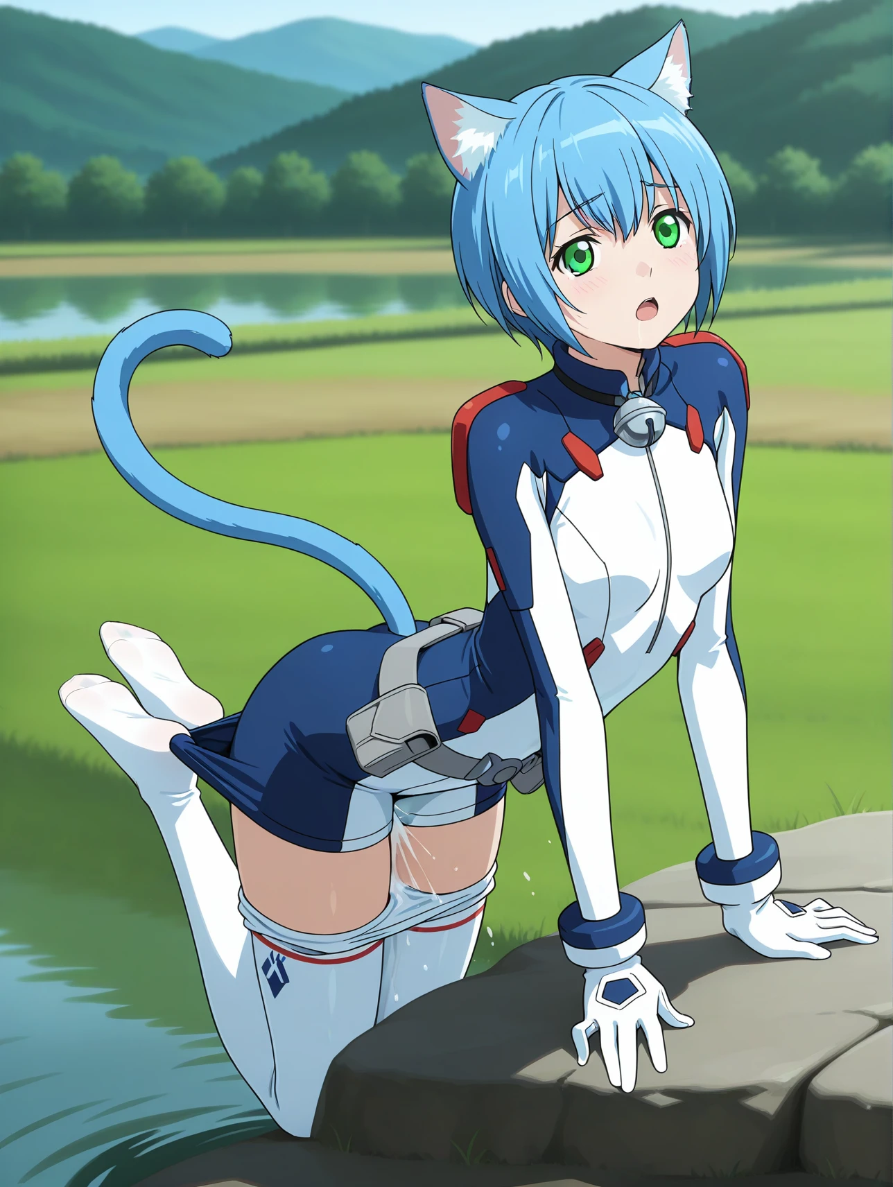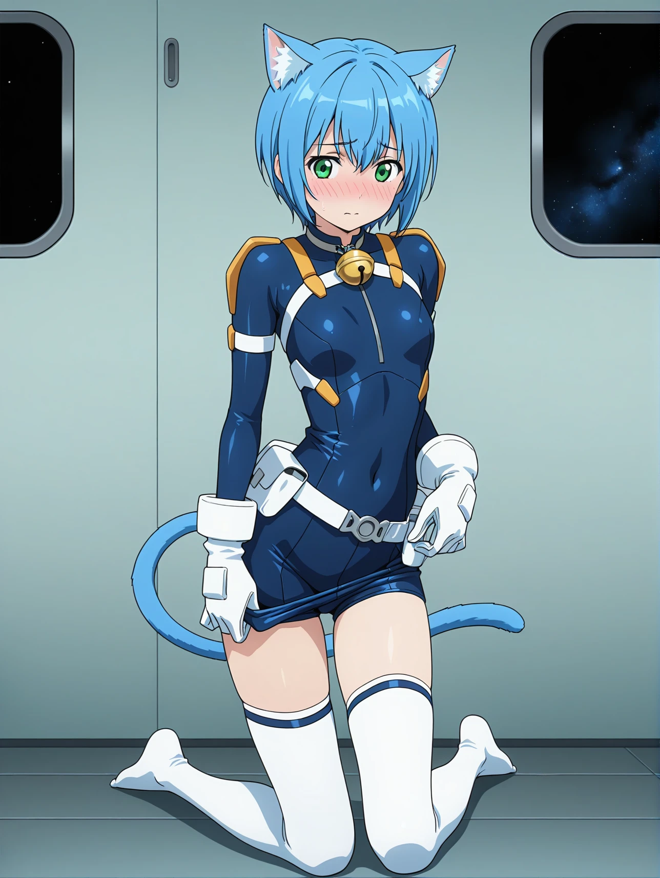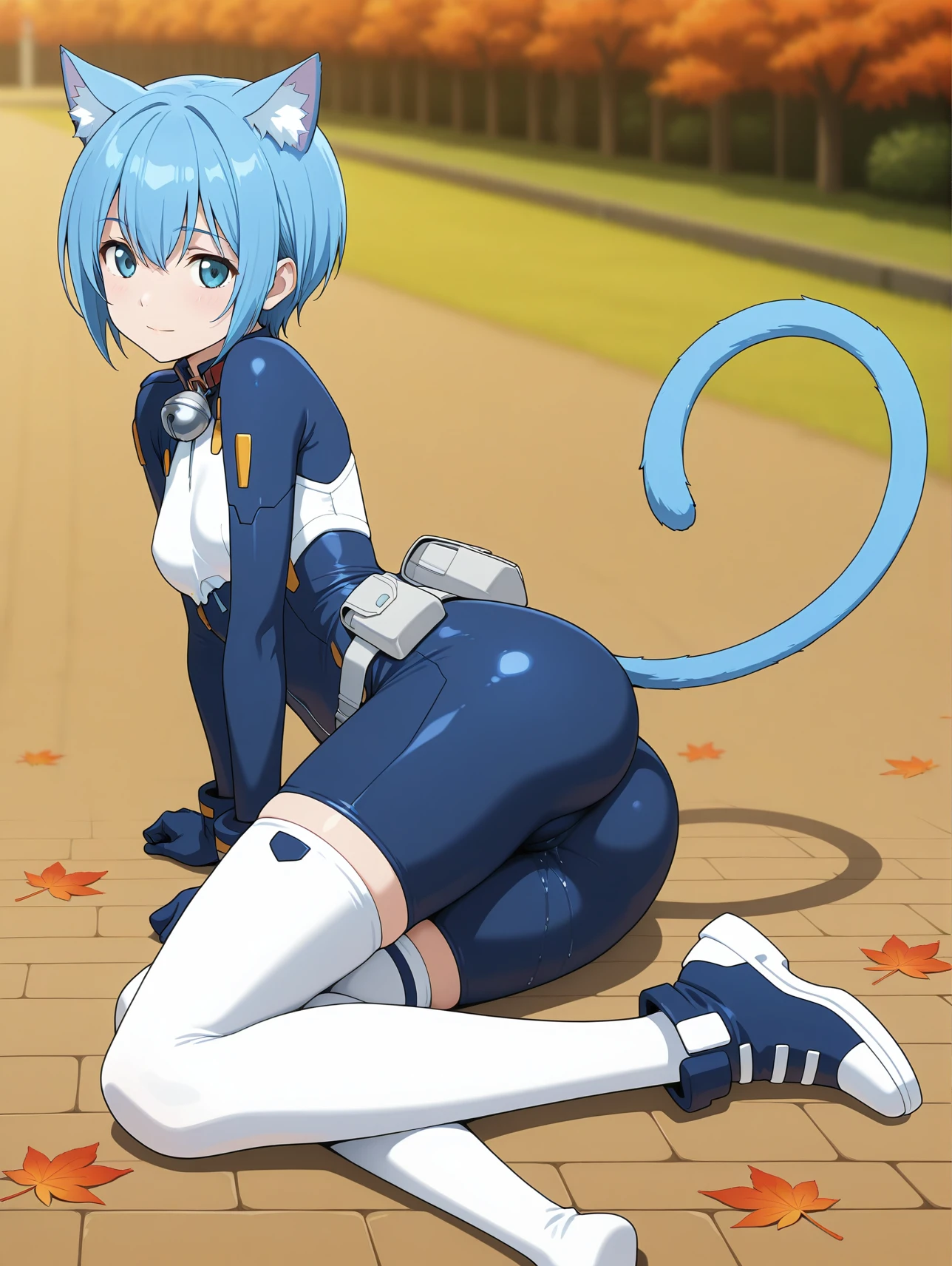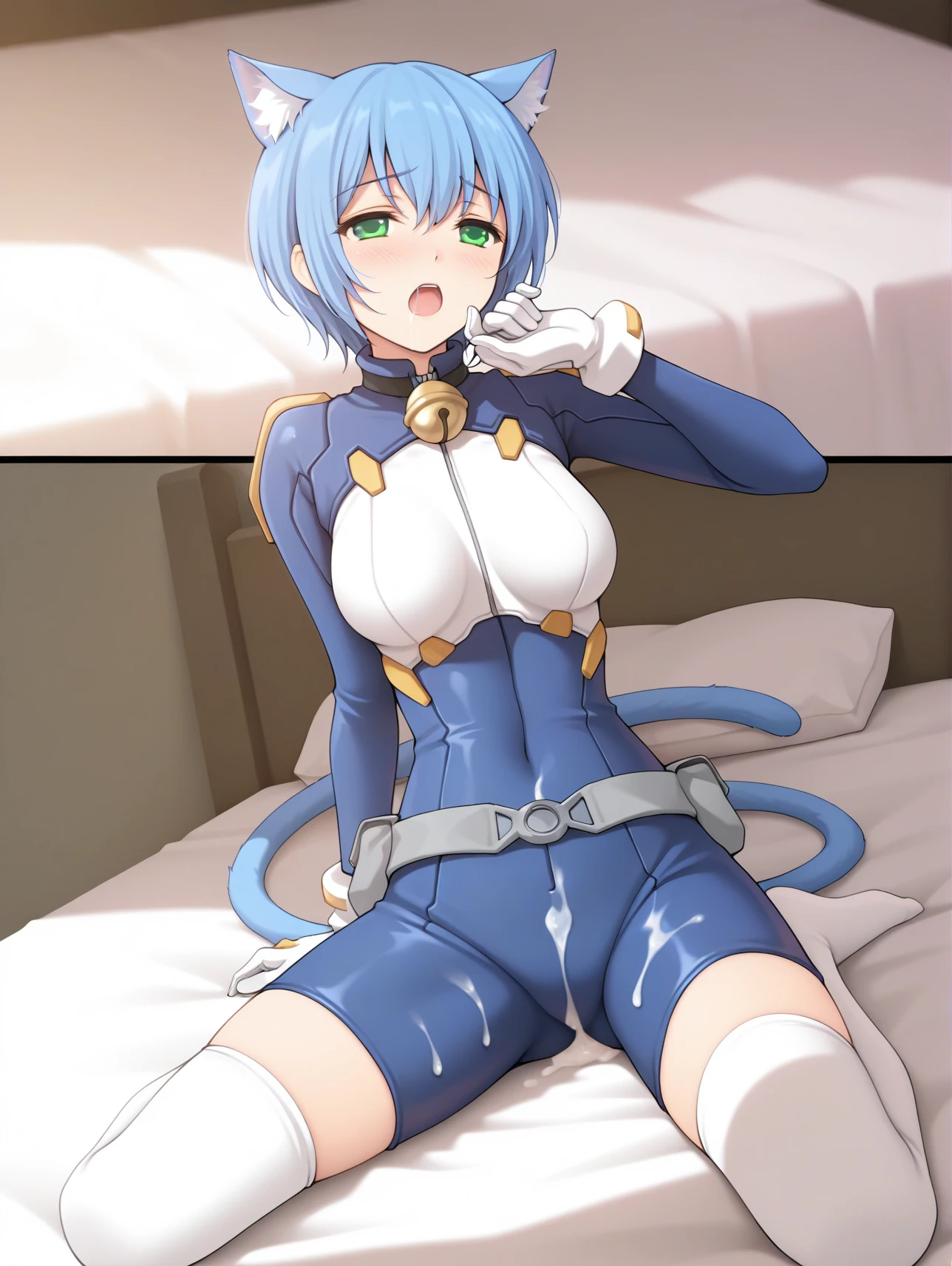 cpc-melwin, aqua eyes, blue hair, short hair, hair between eyes, cat ears, cat tail, neck bell, collar, ascot