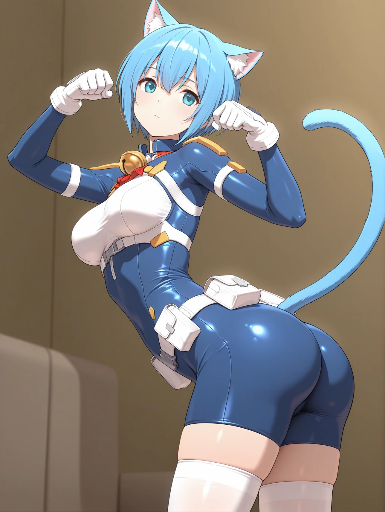 blue bodysuit white chest belt pouch gloves white thighhighs thigh boots