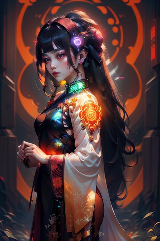1 girl, solo, aodai cyber, neon, cyber world,cyberpunk, long dress, straight hair,in the city, city view, technology, machine, (masterpiece, ultra high res:1.6), upper body, depth of field,