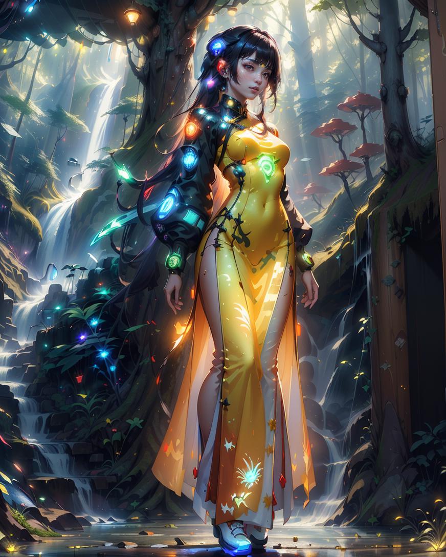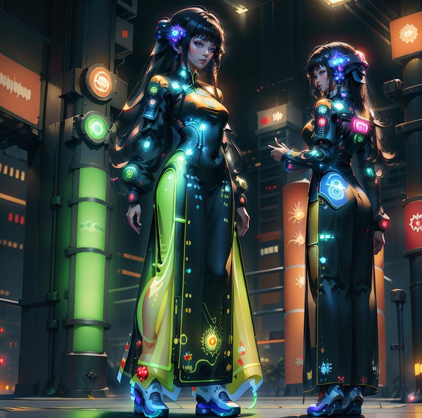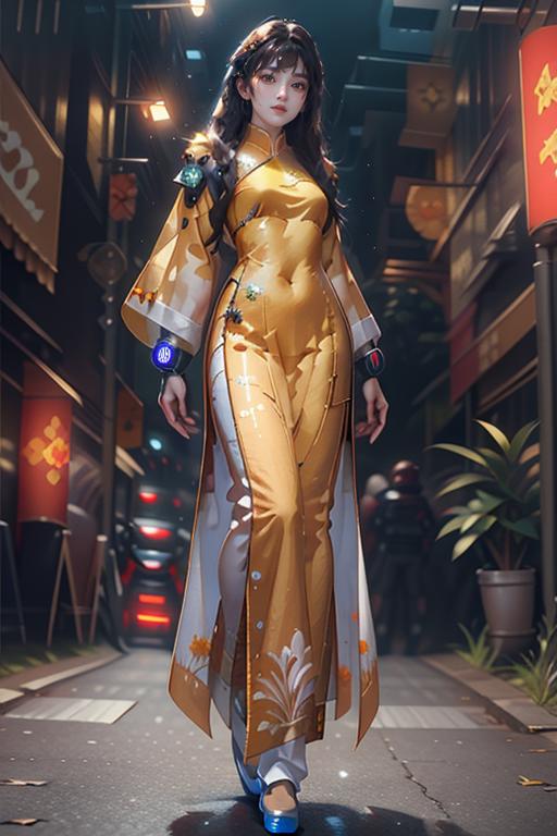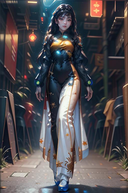 Here is my imaginative depiction of a futuristic Áo Dài, hoping you will like it. I've made efforts to address the occasional issue where the image may portray a girl without pants, resembling the traditional Chinese attire. In such cases, you can try adding "pants, long dress" to the prompt, and "bare thigh, thigh" to the negative prompt to refine the results.