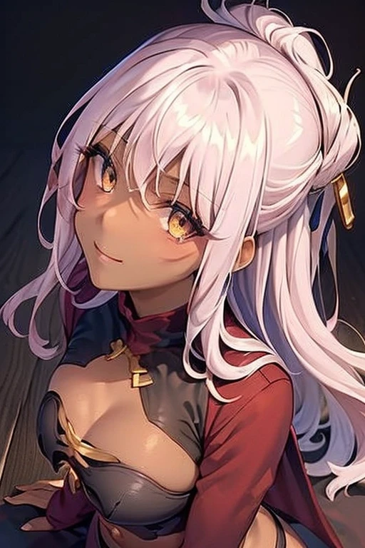 chloe_a, chloe von einzbern, long hair, pink hair, half up, bangs, dark skin, yellow eyes, small breasts, tattoo, stomach tattoo, hair ornament,