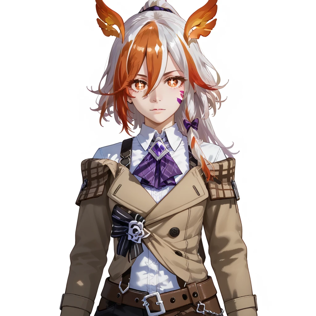 fu hua bengluo,fu hua,messy hair,jewelry,ponytail,eyelashes,facial mark,head wings,two-tone hair,tattoo,ribbon,bangs,white hair,orange eyes,streaked hair,orange hair,fiery hair,hair between eyes,multicolored hair,hair ornament,hair ribbon,pattern on hair,yellow pupils,diamond shaped pupils,gloves,thighhighs,shorts,striped bow,jewelry,coat,plaid,collared shirt,necktie,long sleeves,suspenders,kneehighs,purple bow,white shirt,bowtie,purple bowtie,shirt,jacket,brooch