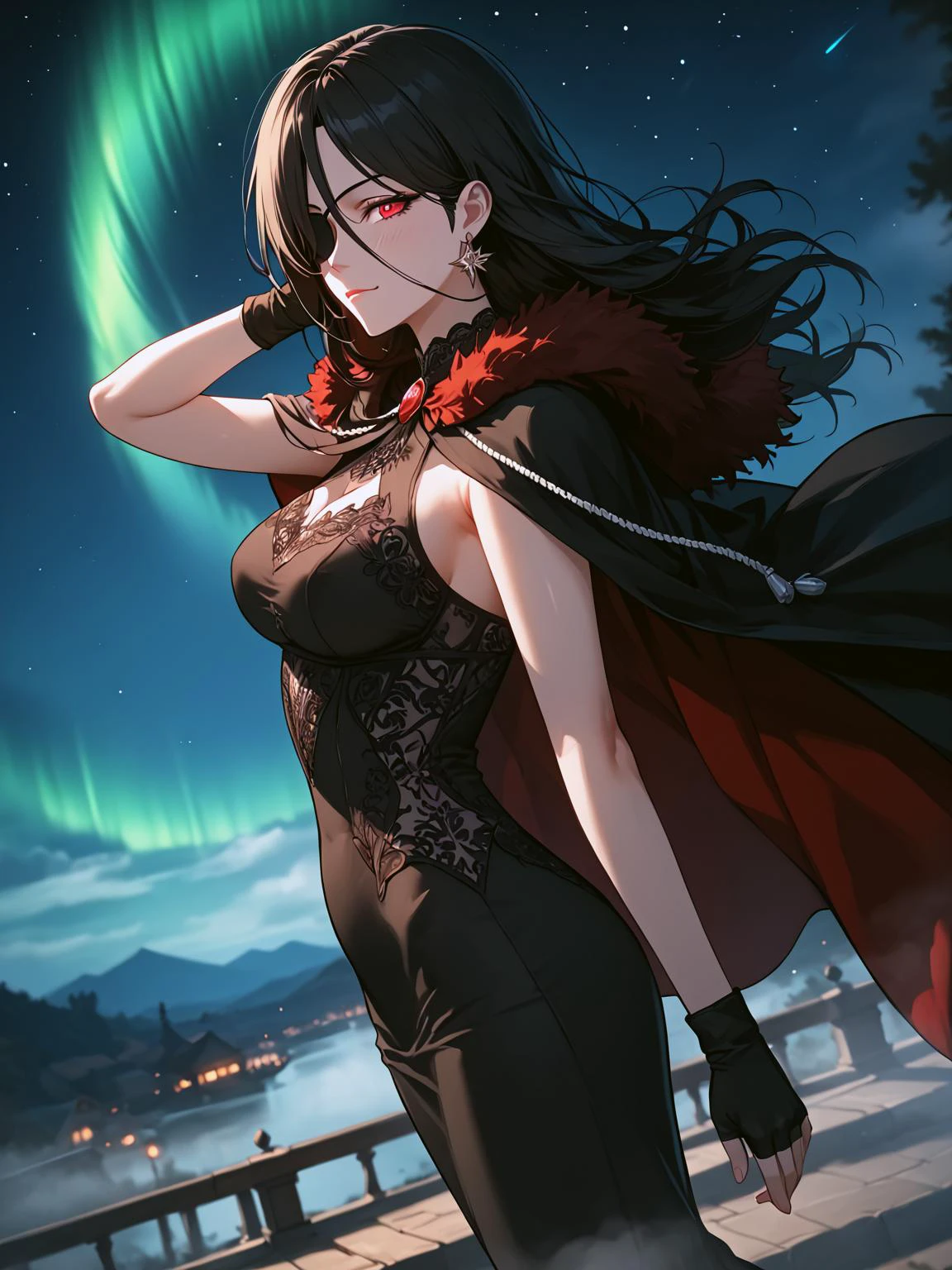 black hair, long hair, red eyes, hair between eyes, eyepatch, one eye covered