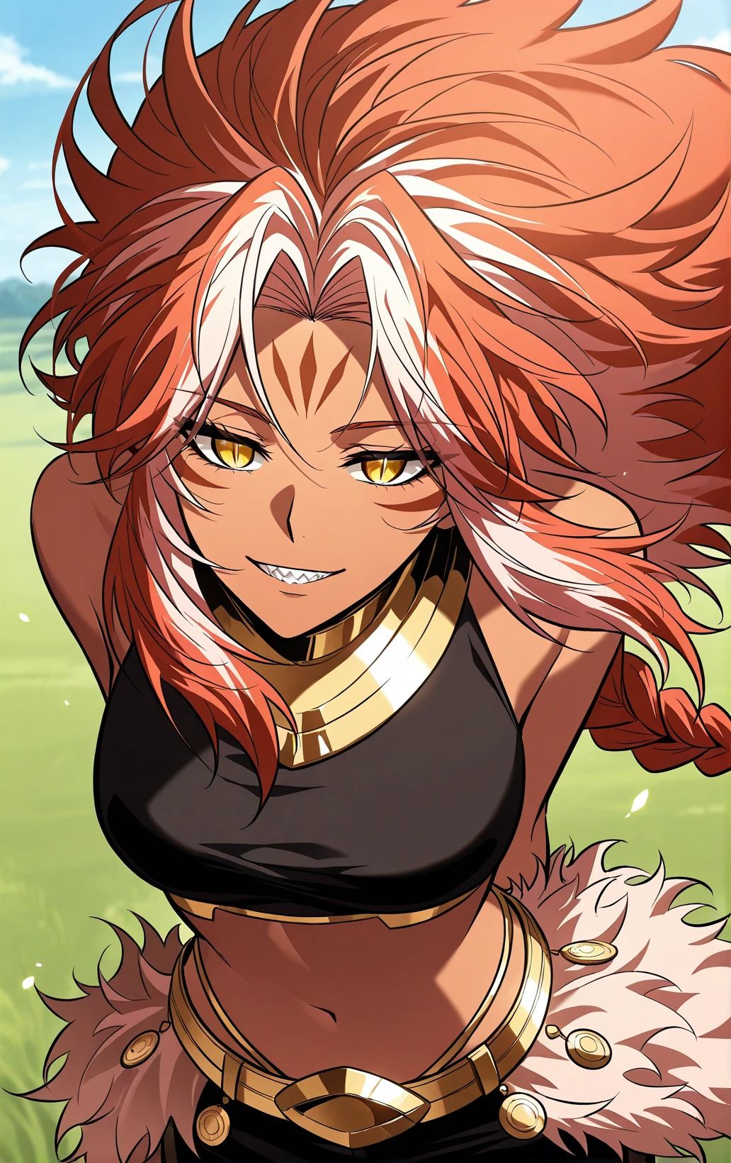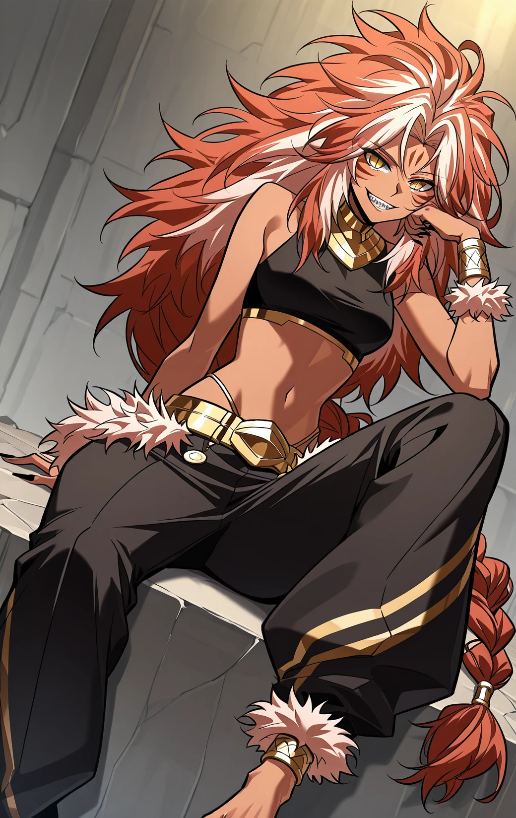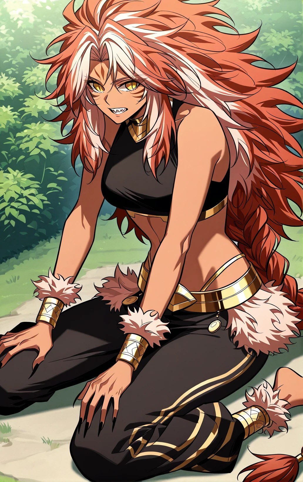 Kishasha, 1girl, solo, dark skin, yellow eyes, slit pupils, orange hair, white hair streaks, very long hair, wild hair, messy hair, spiky hair, thick hair, parted bangs, hair between eyes, long sidelocks, low ponytail, braided ponytail, sharp teeth, long nails, black nails, sharp nails, forehead mark, facial markings,