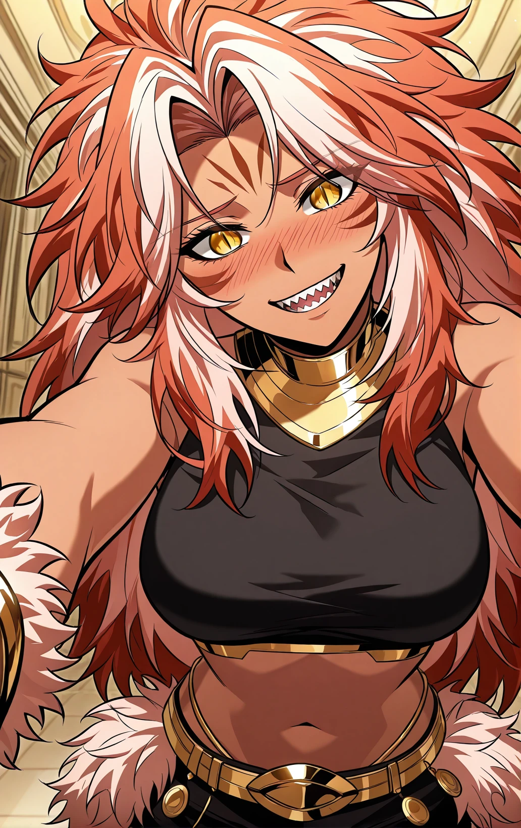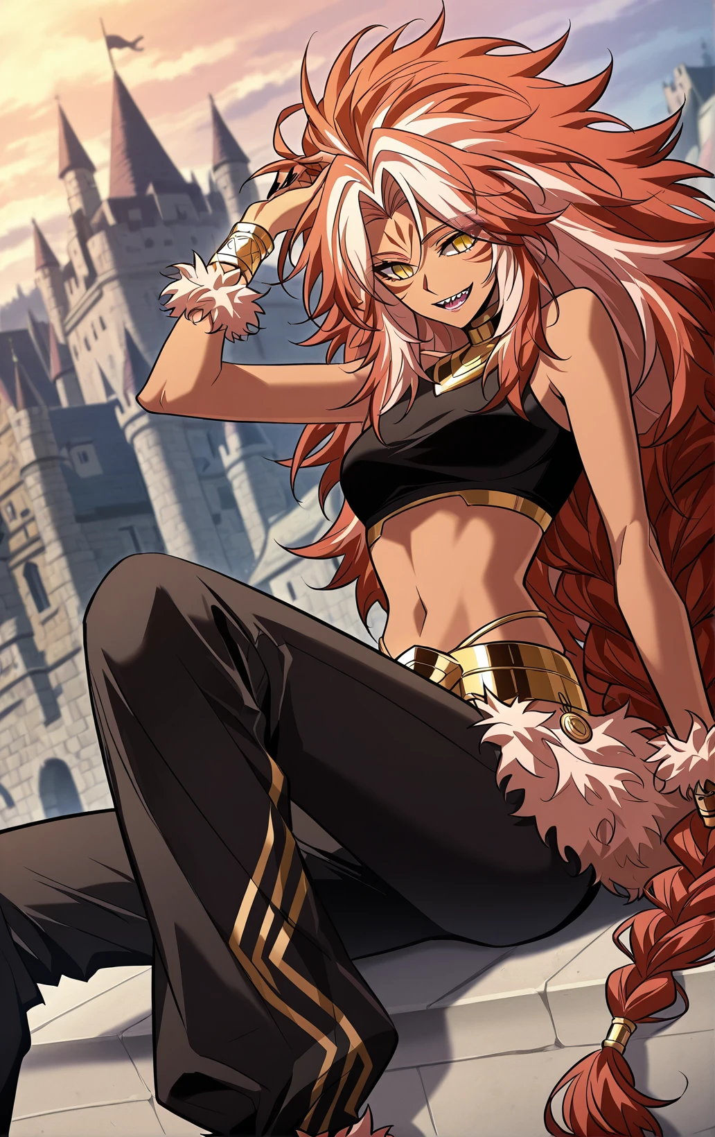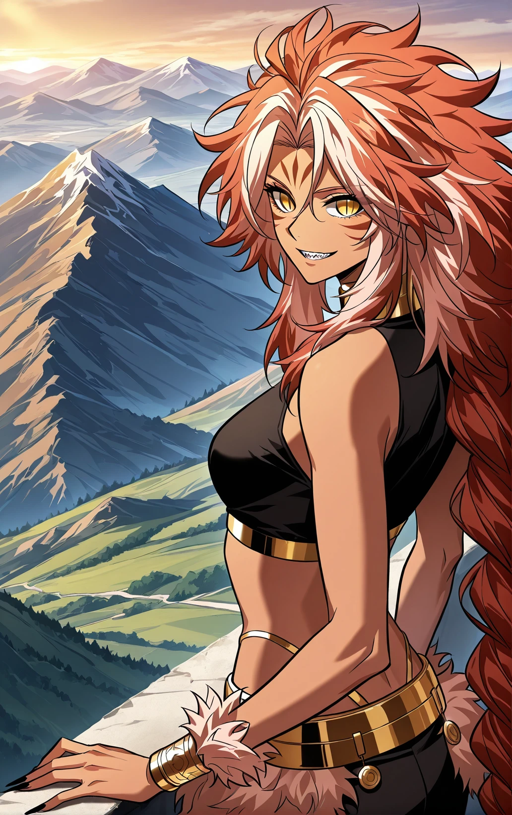 Kishasha, 1girl, solo, dark skin, yellow eyes, slit pupils, orange hair, white hair streaks, very long hair, wild hair, messy hair, spiky hair, thick hair, parted bangs, hair between eyes, long sidelocks, low ponytail, braided ponytail, sharp teeth, long nails, black nails, sharp nails, forehead mark, facial markings,