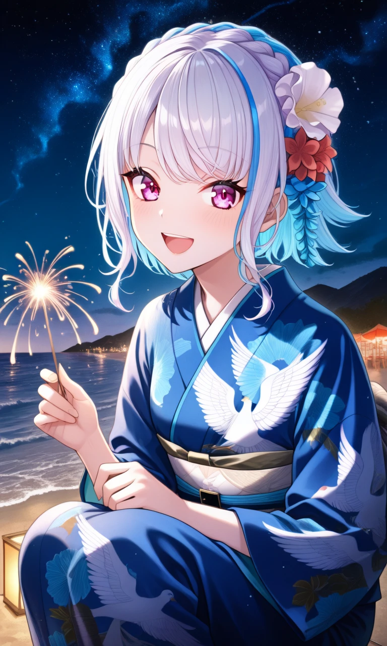 lize7th azur, short hair, crown braids, hair flower, blue kimono, bird print, obi