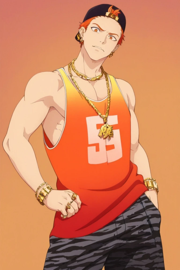 Satsuki Ito, orange hair, backwards cap, orange eyes, ear piercings, gold necklaces, tiger necklace, orange basketball tank top number 55, gold bracelets, gold rings, hip handkerchief, tiger print shorts, leg tattoo, black and red shoes