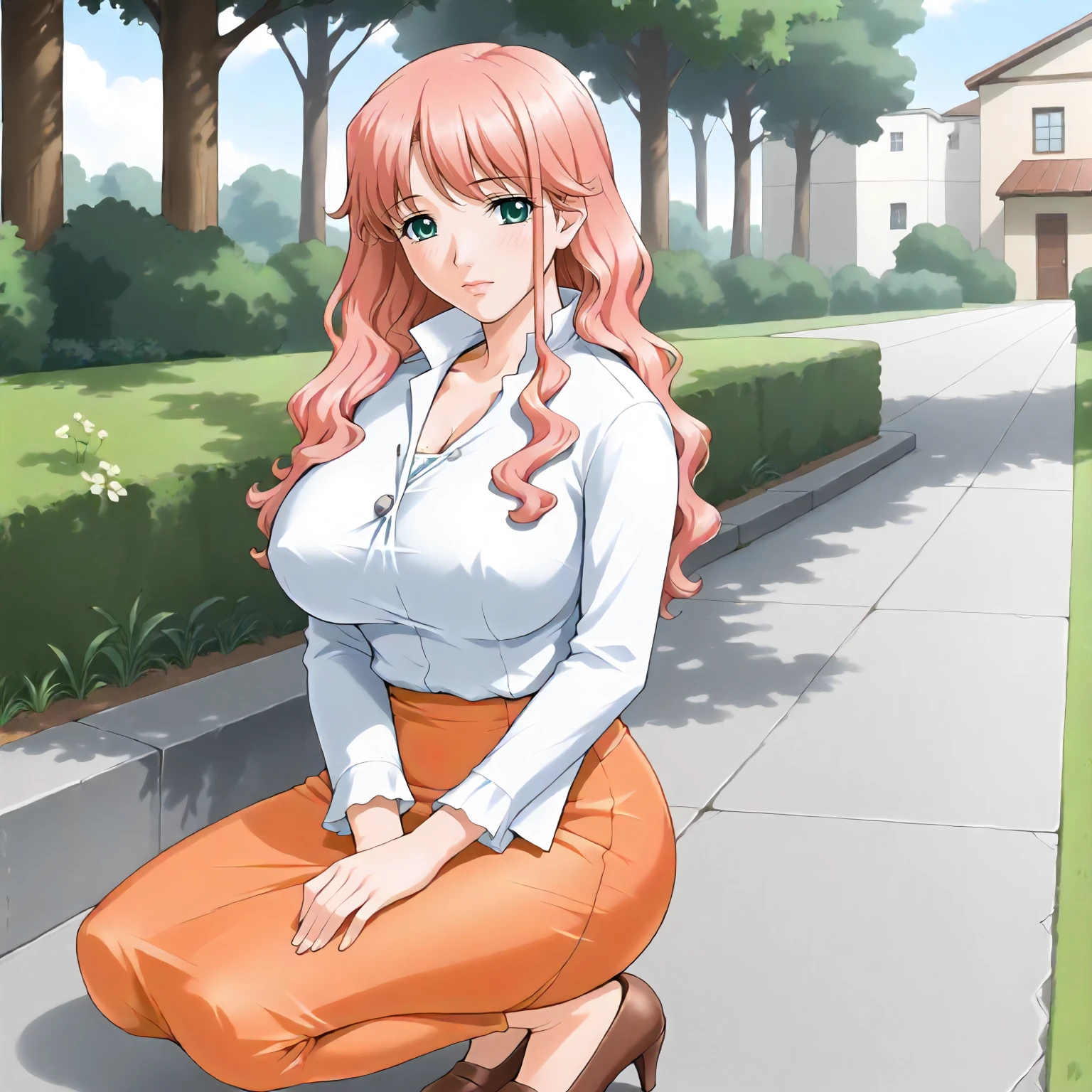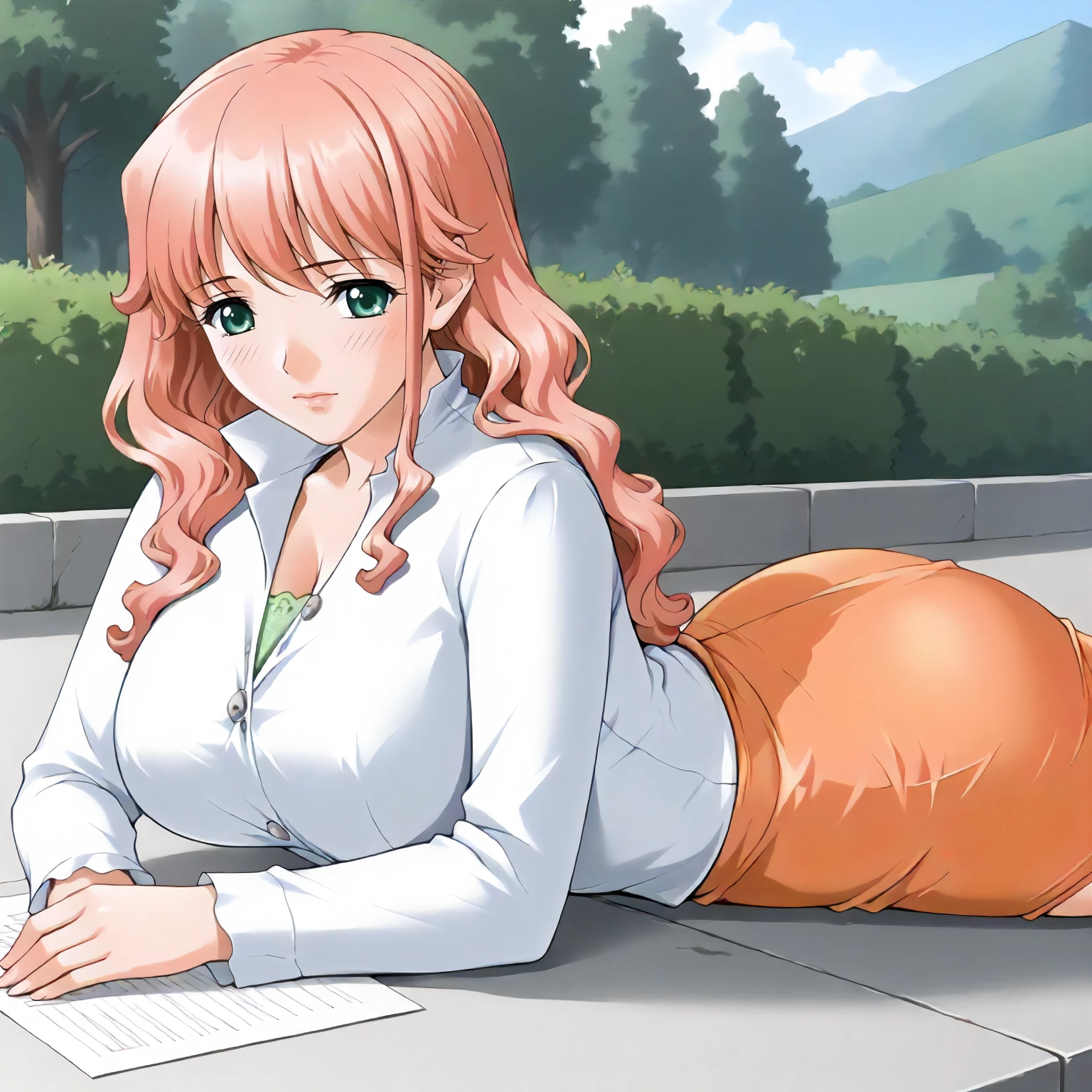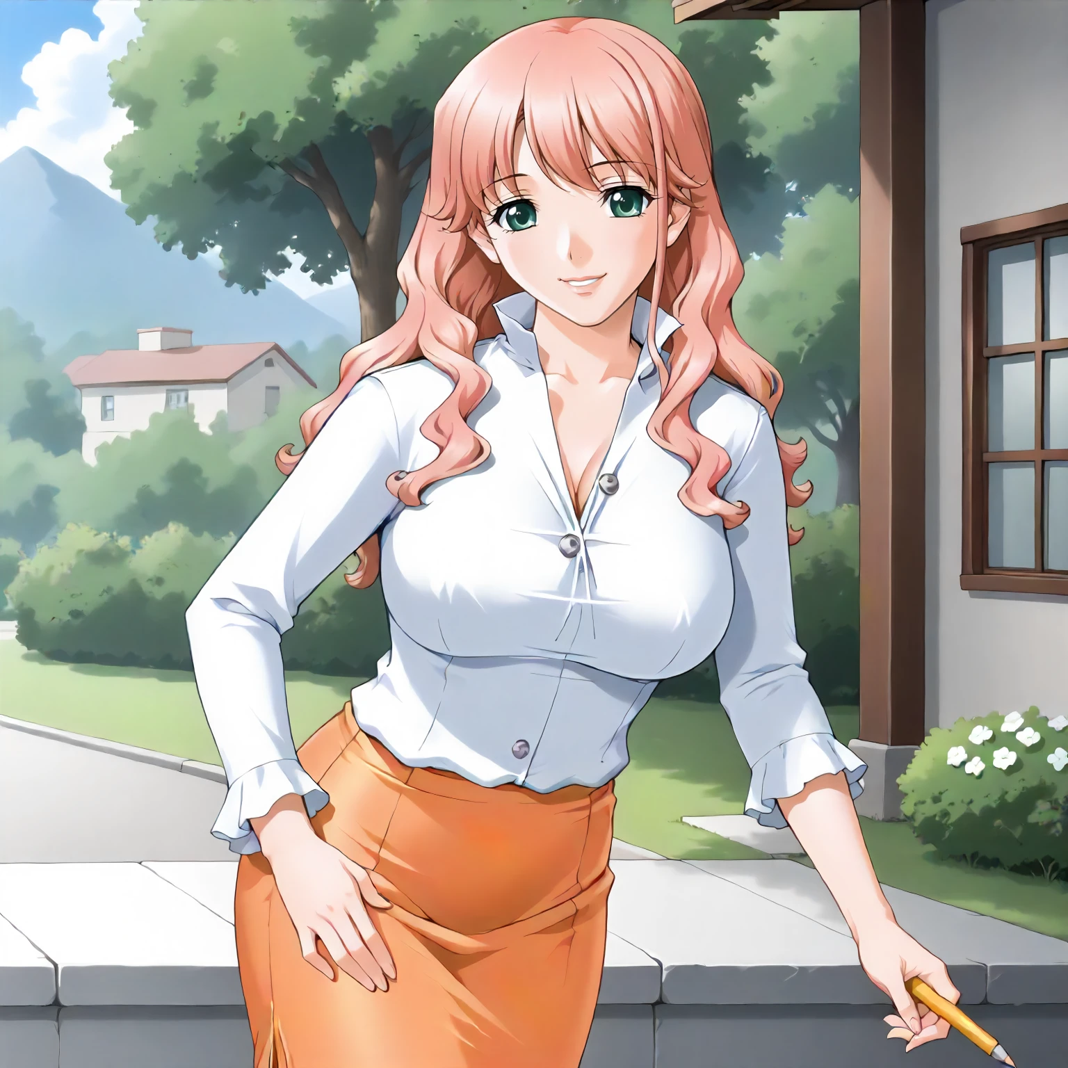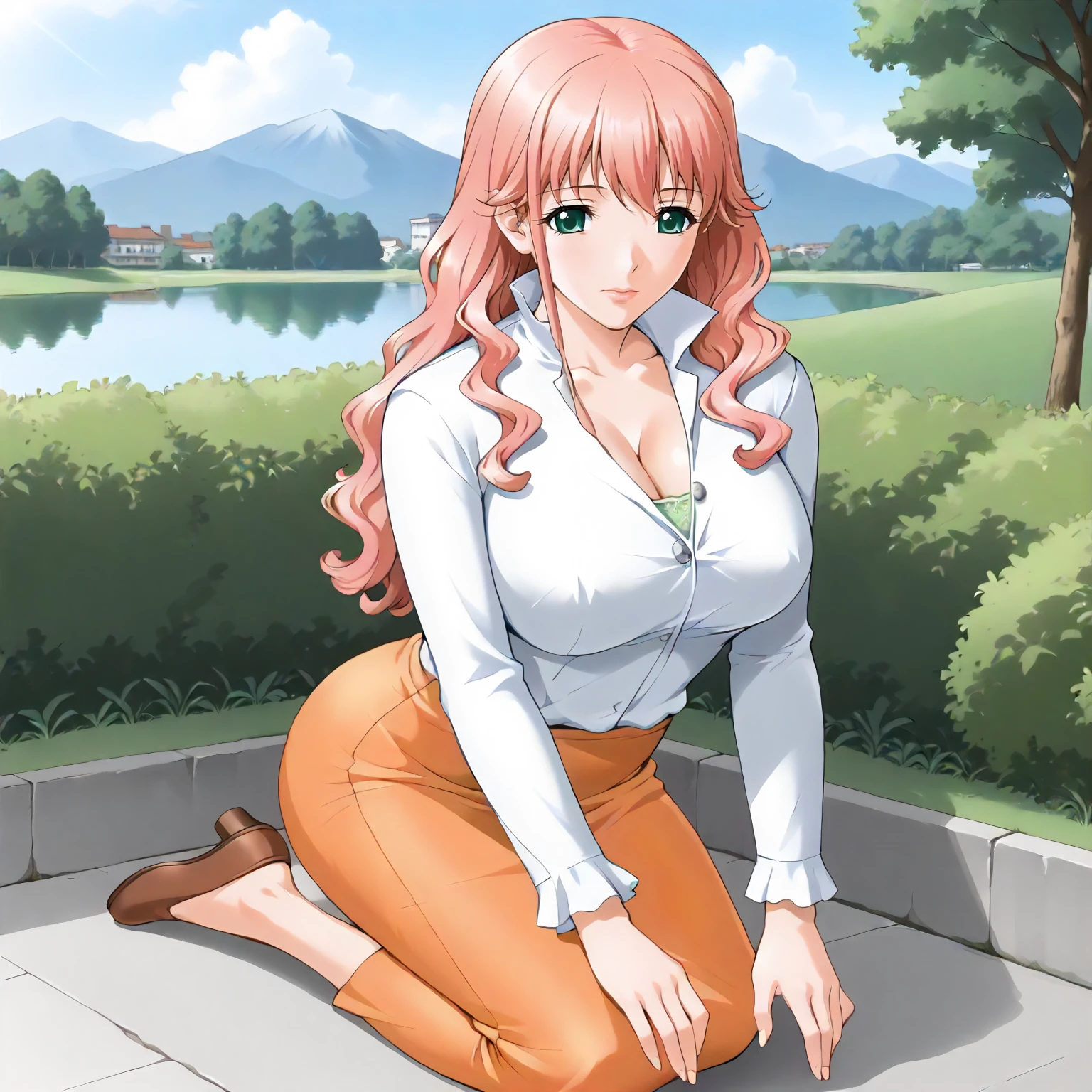 RemonHanamaru,1girl,mature female,pink hair,long hair,green eyes, large breasts,
