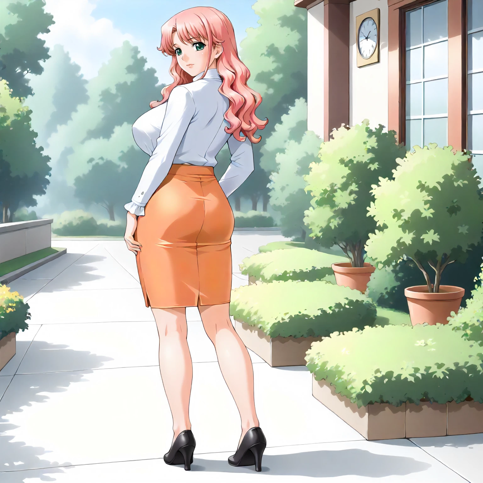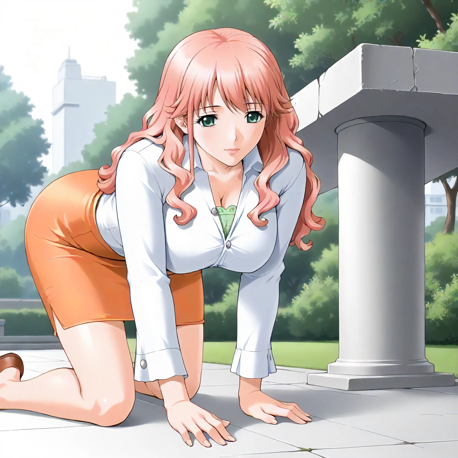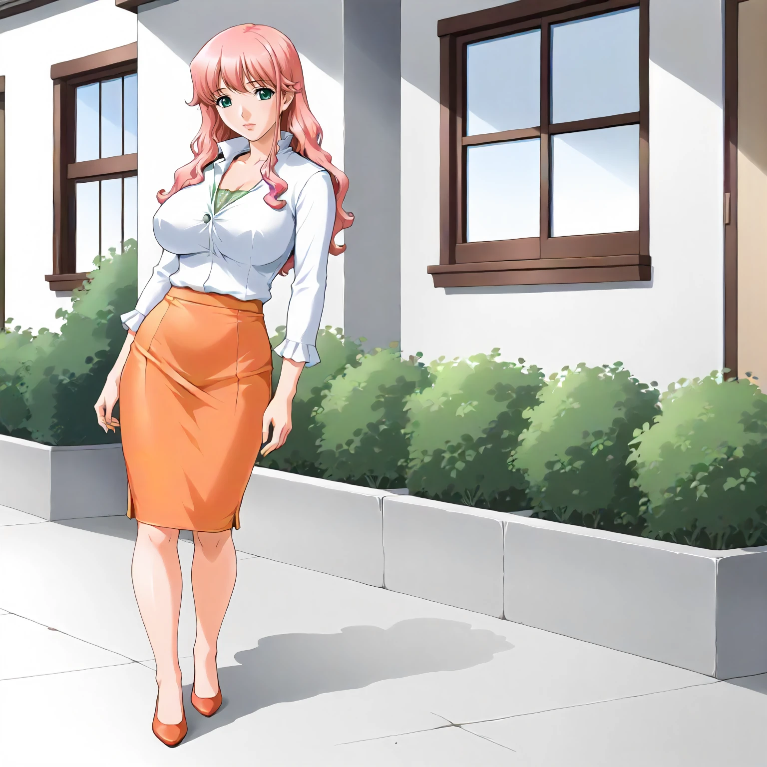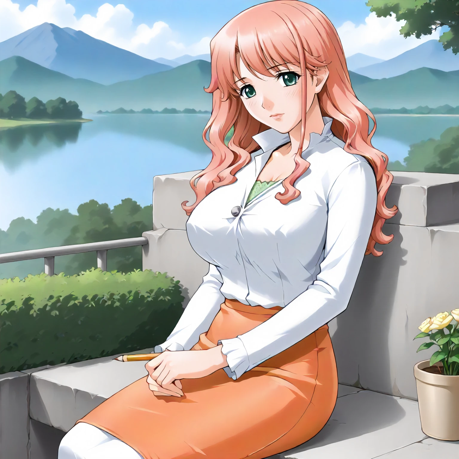 RemonHanamaru,1girl,mature female,pink hair,long hair,green eyes, large breasts,