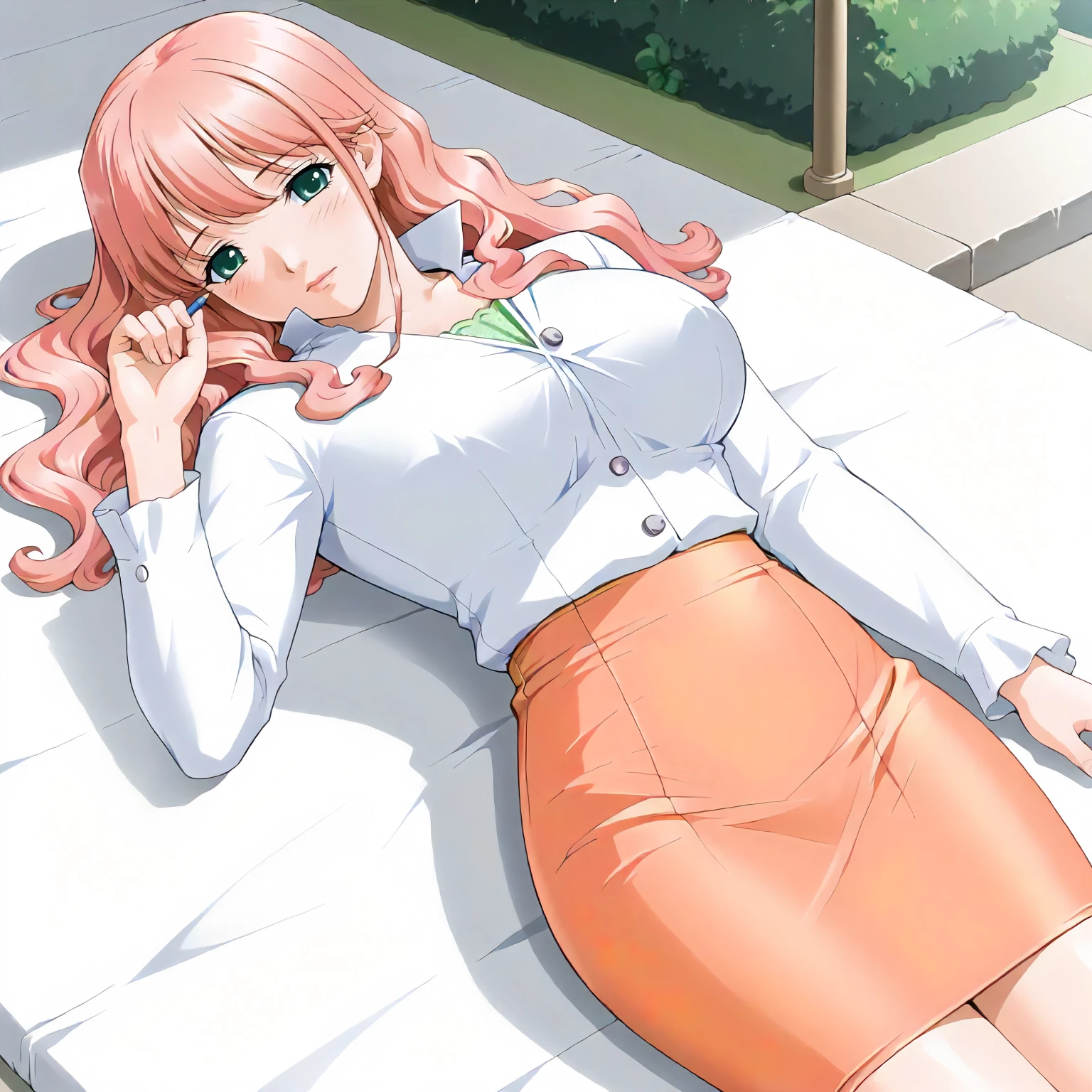 white shirt,dress_shirt,cleavage,frill sleeve, pencil_skirt,orange skirt,