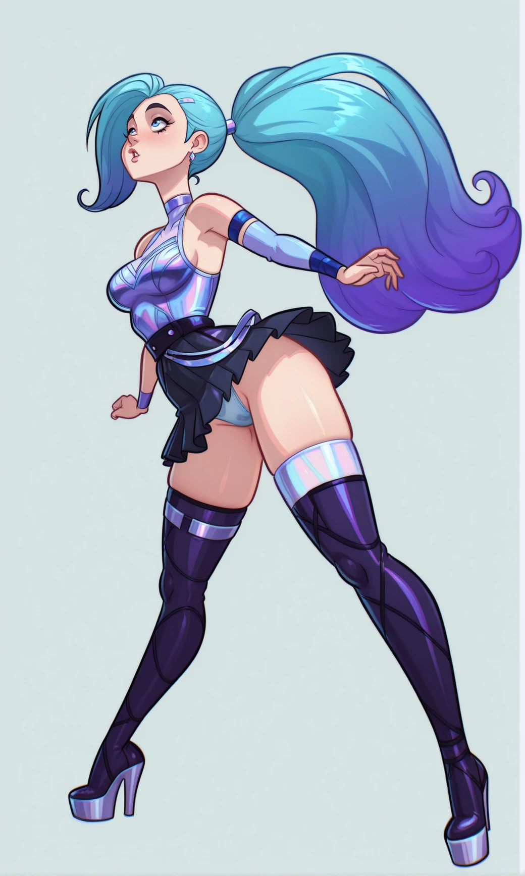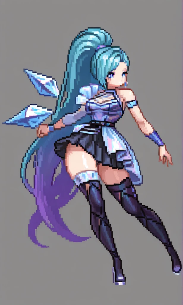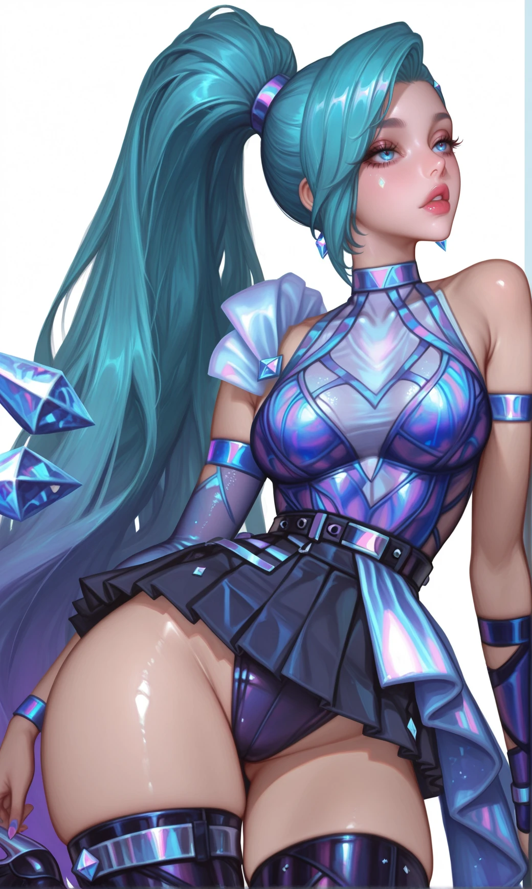 KDA_A_O_SSt_Seraphene, long hair, aqua blue hair, high ponytail, side-swept bang, blue eyes, slim body, purple blue outfit ,sleeveless dress, crossed straps, dark pleated skirt, thigh-high boots, heels, blue arm bands , single sleeve,