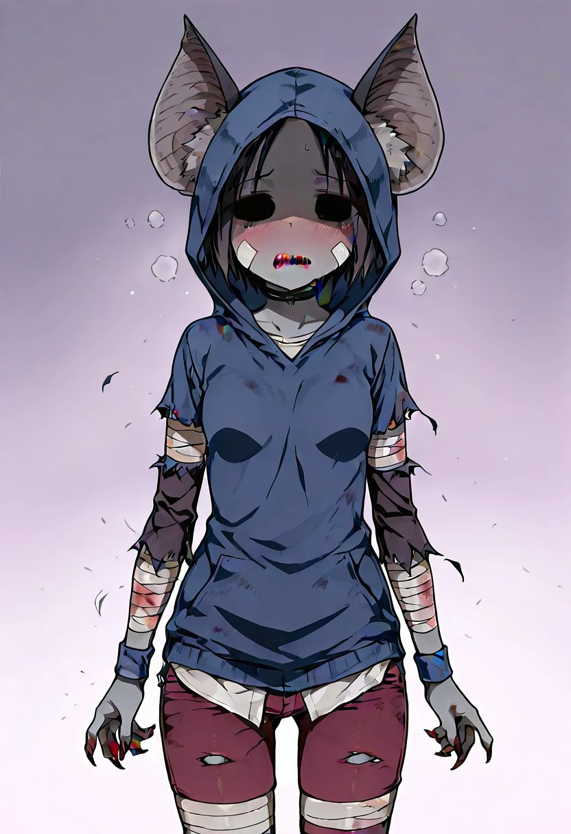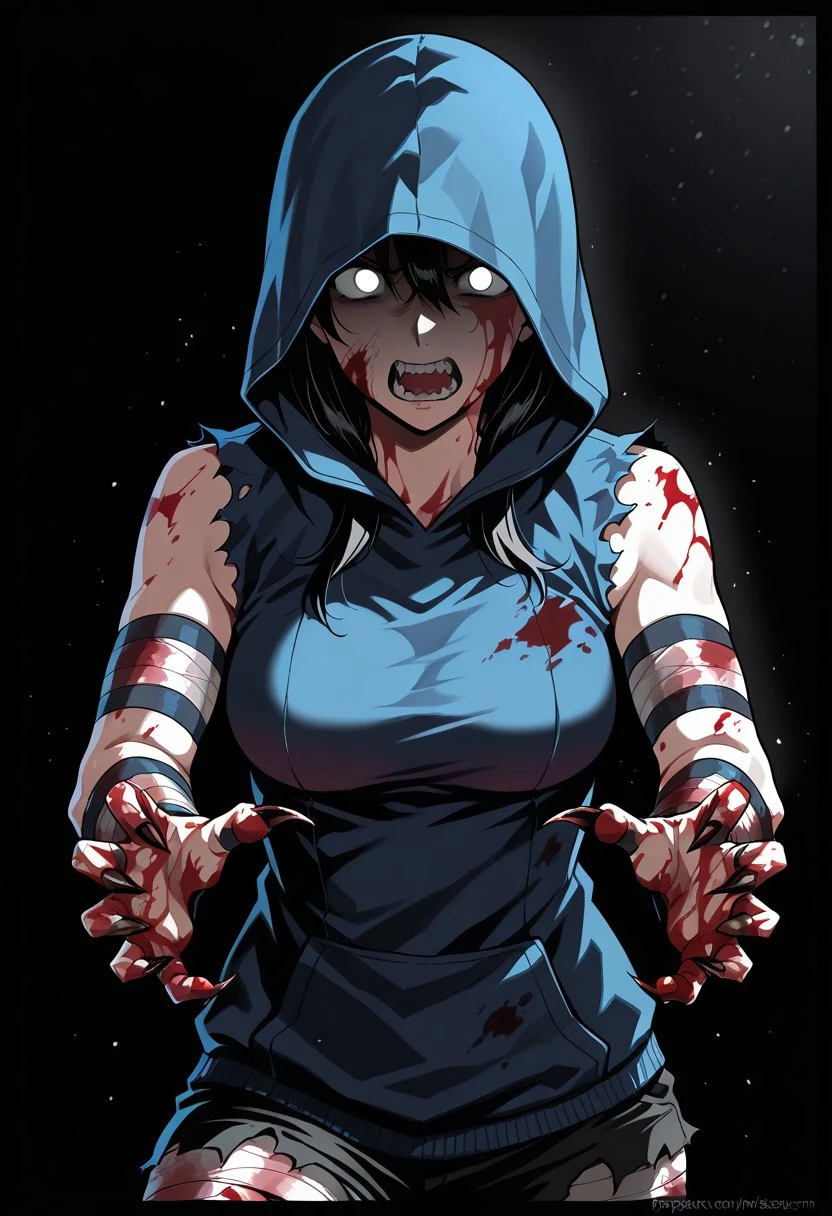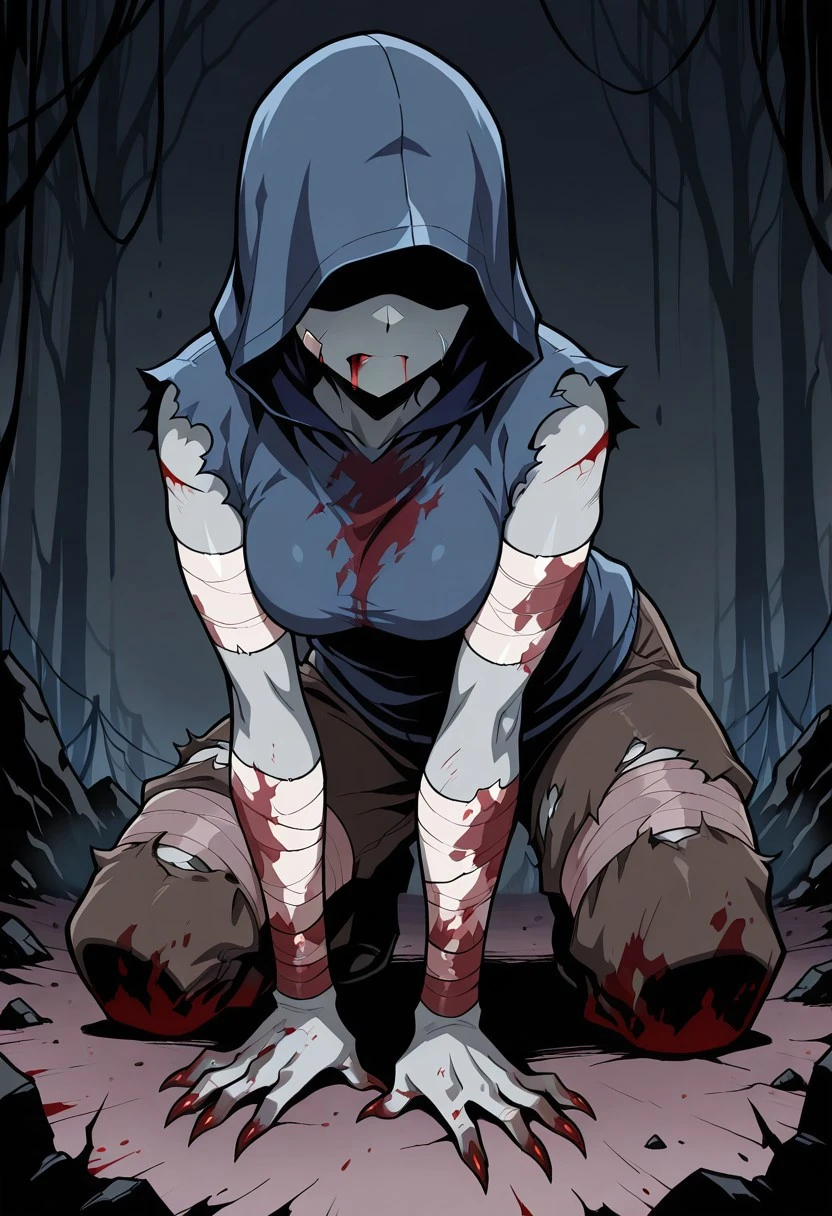 Blue hood, bandages on arms, torn clothing, and bloody clothing.
