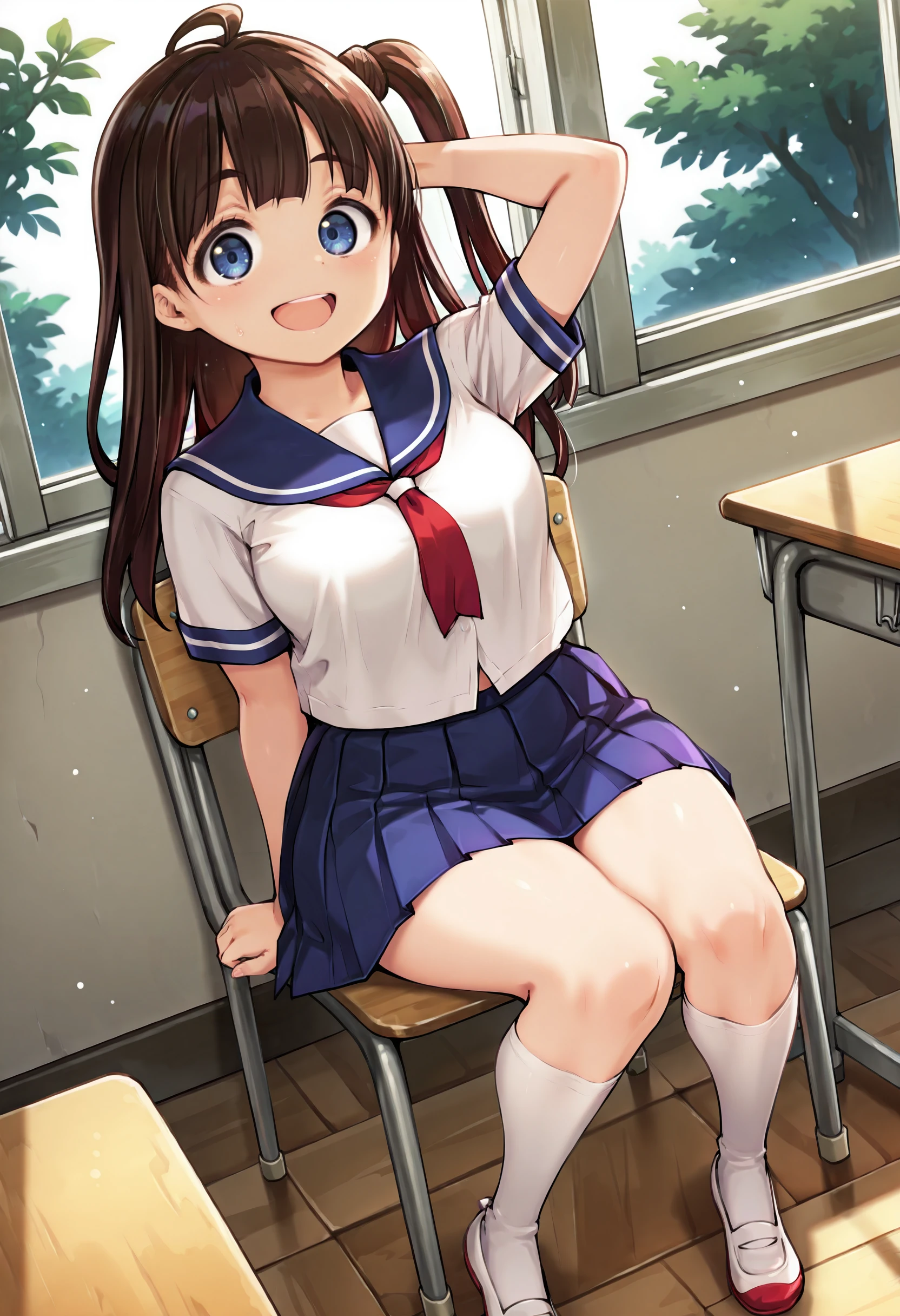 #1: school uniform, serafuku, white shirt, blue skirt, pleated skirt, kneehighs, shoes