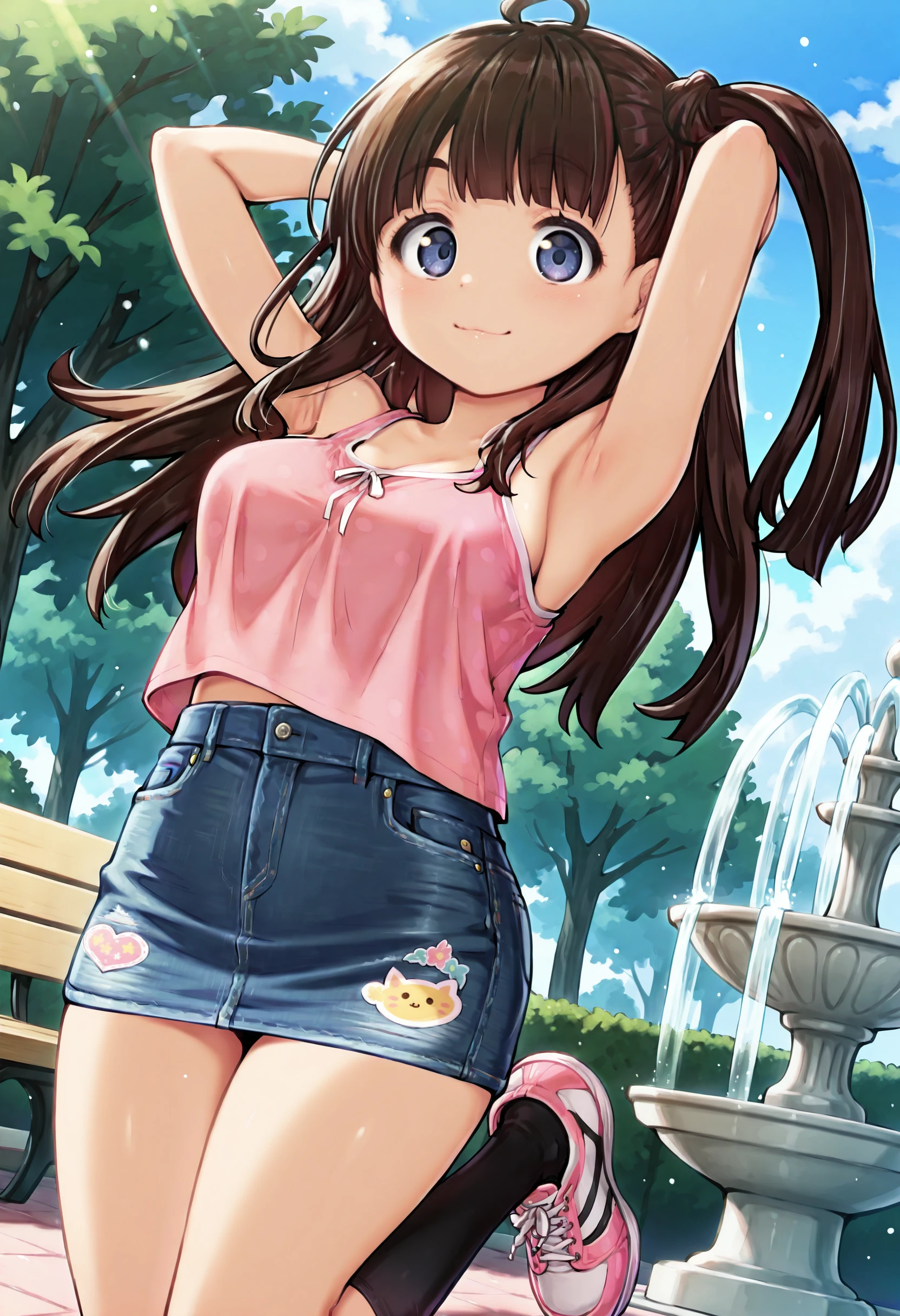#2: denim skirt, pink tanktop, black kneehighs, sneakers