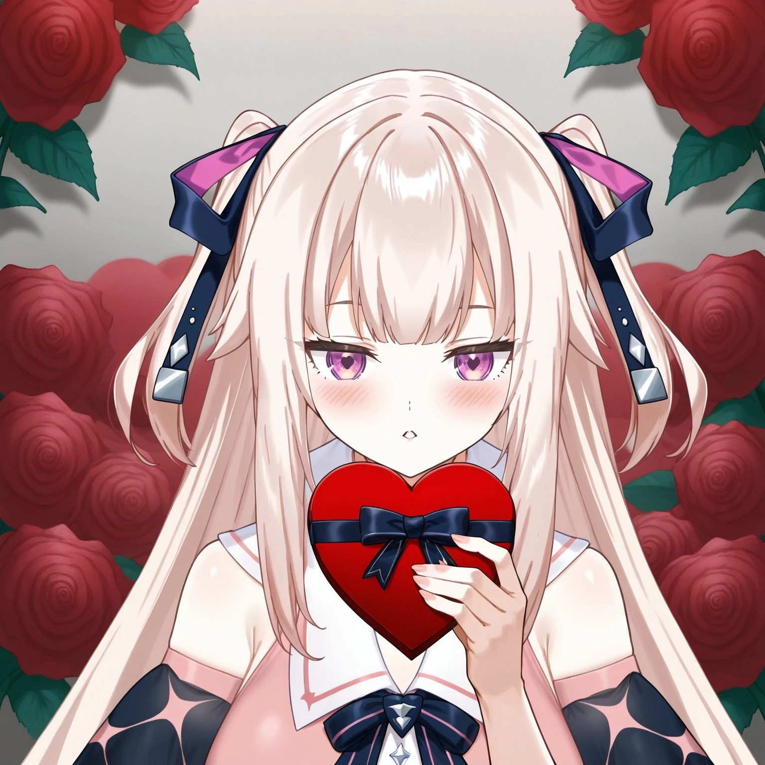 ikun1, 1girl, solo, long hair, looking at viewer, blush, bangs, hair ornament, ribbon, purple eyes, collarbone, pink hair, detached sleeves, virtual youtuber, two side up, breasts, dress, bow, medium breasts, boots, pink eyes, pink dress, blonde hair