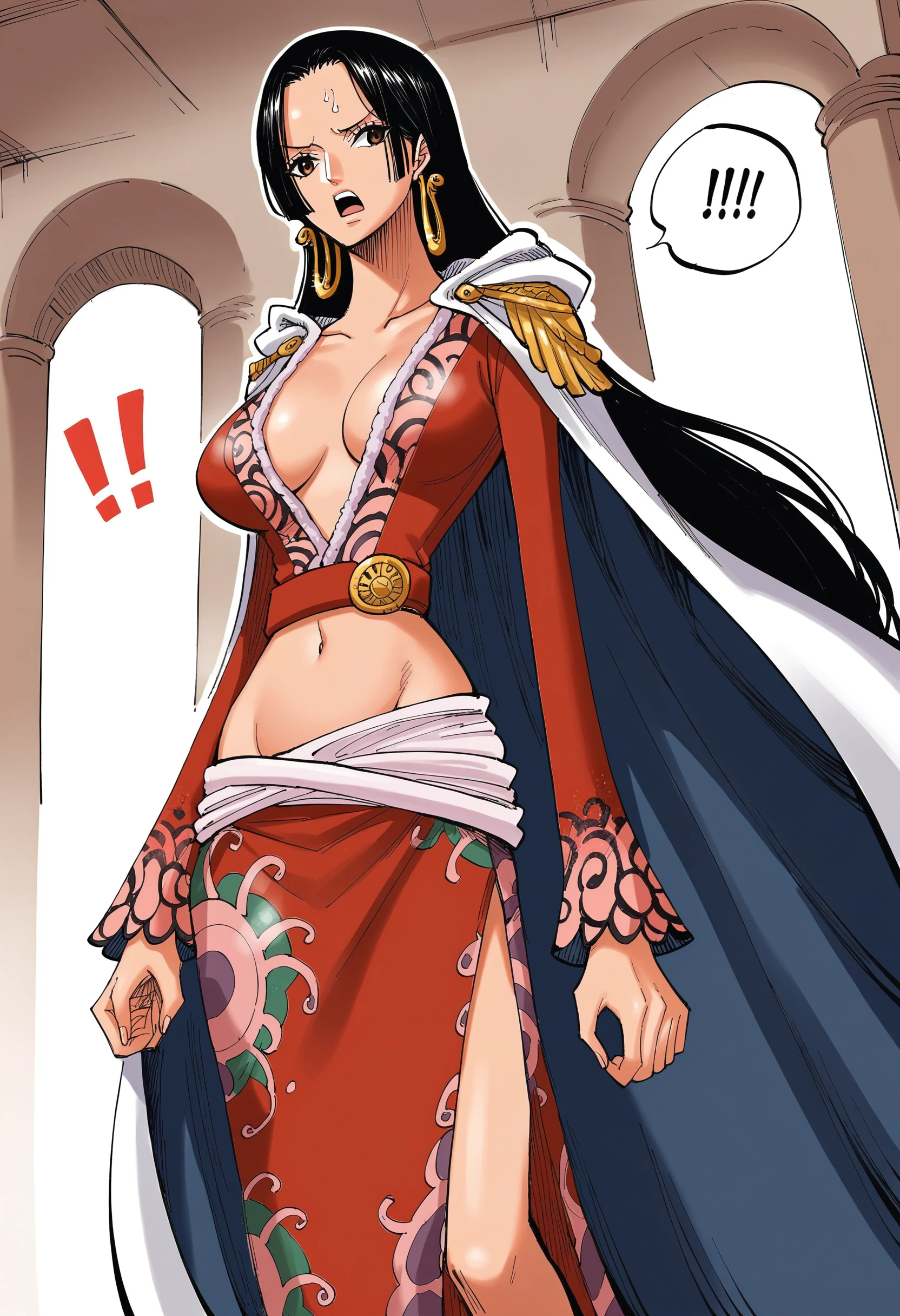 "standard outfit, large breasts, cape, navel"