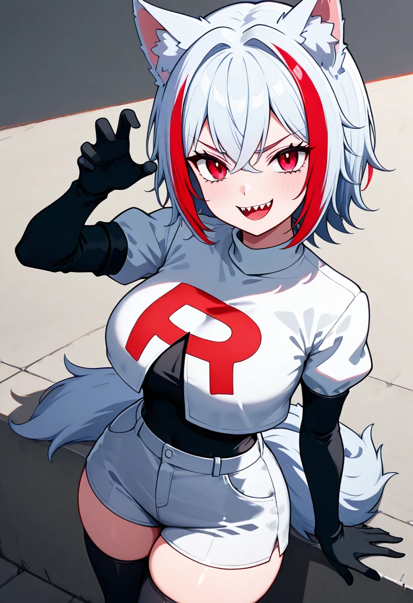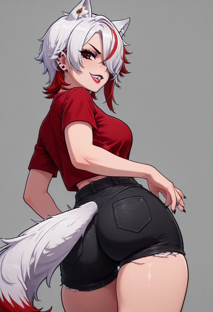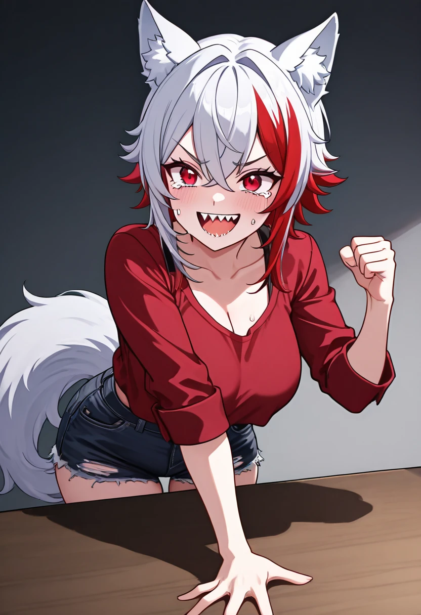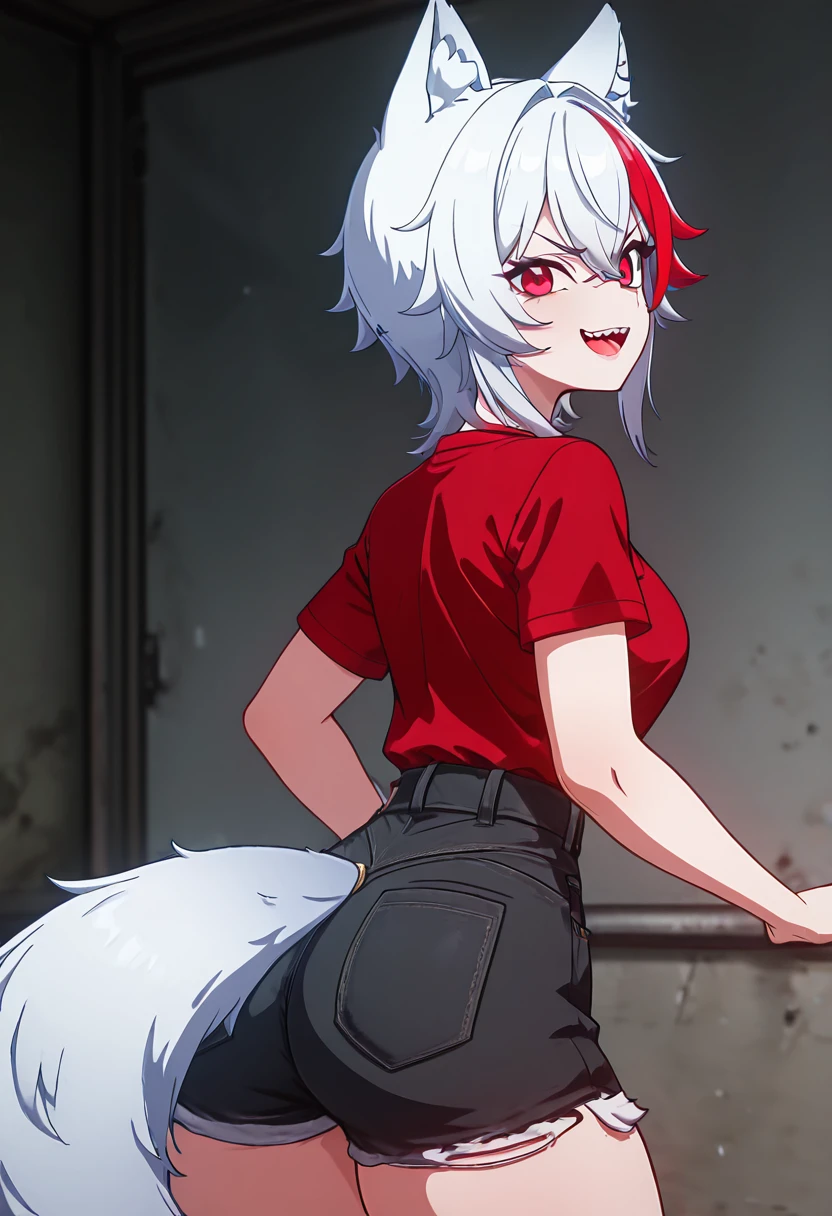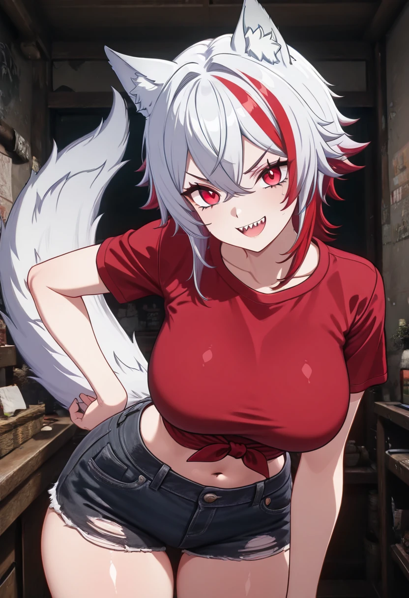 zzJiam, red eyes, white hair, short hair, red hair, streaked hair, multicolored hair, v-shaped eyebrows, sharp teeth, wolf girl, wolf ears, red shirt, black shorts, denim shorts, short shorts, wolf tail,