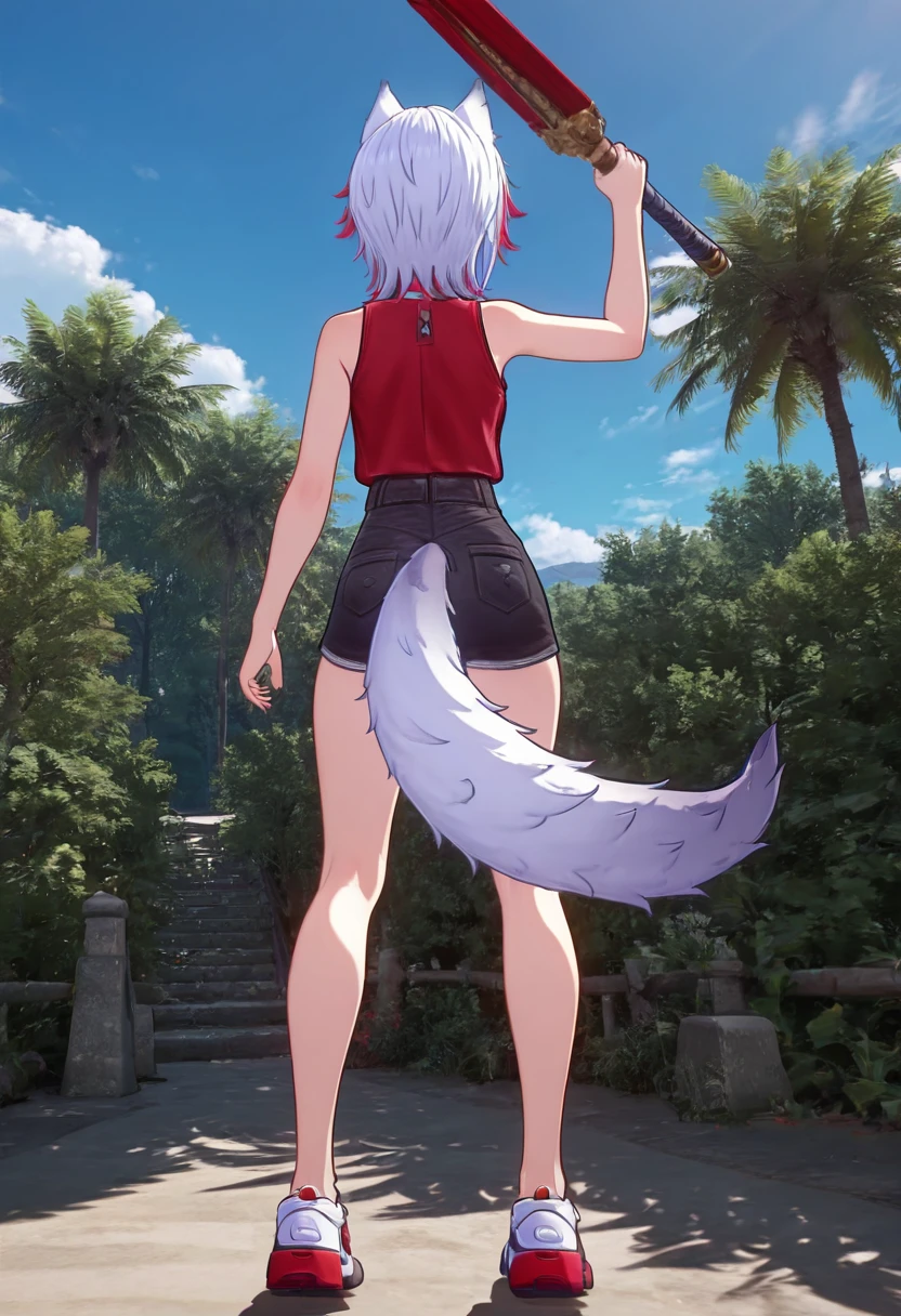 red shirt, black shorts, denim shorts, short shorts, wolf tail,