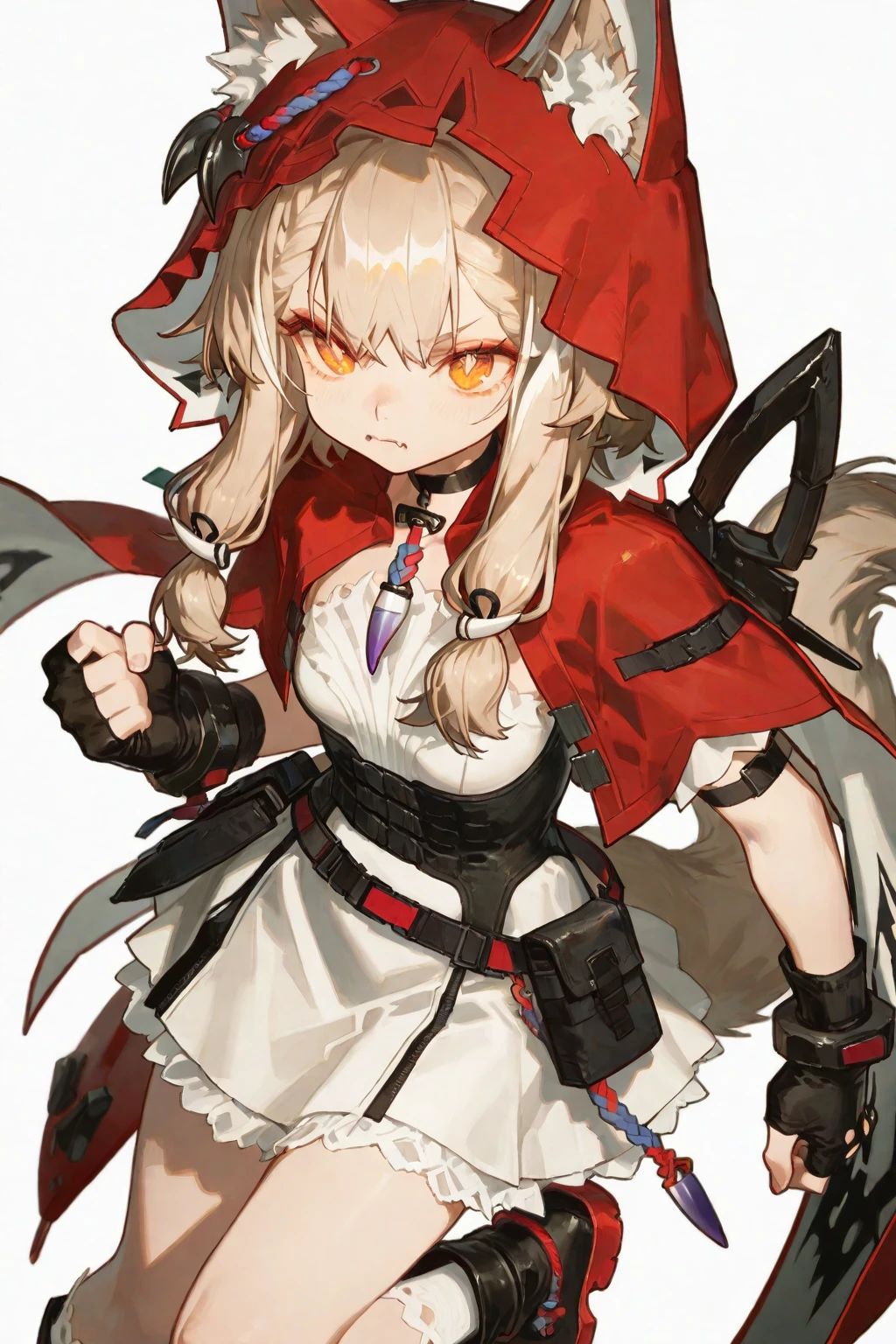 rossi, 1girl, solo, gradient eyes, orange eyes, diamond-shaped pupils, light brown hair, white striped hair, medium hair, braid, fanged bangs, low twintails, fang hair ornament, wolf ears, animal ear fluff, ears through headwear, red and blue rope, black choker, snap-fit buckle, purple tooth necklace, red hooded split cloak, hood up, black metal ornament on head, metal claw on cloak,#后背要加 zipper, purple ribbon on cloak, black arm strap, black fingerless gloves, white and black frilled sleeveless short dress, side cutout, white frilled skirt under white dress, metal waist accessories, black ribbon, black corset, black and red open belt, black belt pouch, wolf tail, black thigh bag, white lace-trimmed socks, black boots, red shoe soles,