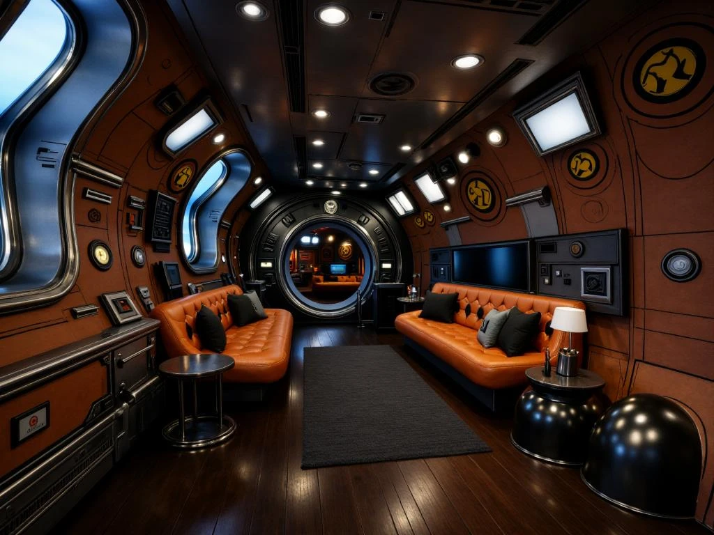 Retro-futuristic Spaceship Interior, cinematic realistic lounge inside an advanced spacecraft with curved orange paneled walls and oval windows casting soft diffused light into a warm industrial environment. Tufted orange sofas with dark and light blue cushions line the seating area while sleek metal side tables hold small objects. A circular metallic corridor forms a central passage connecting compartments. Warm ceiling lights reflect across dark wood flooring. A textured grey rug grounding the space. Wall-mounted retro-futuristic display panel integrated into the spacecraft interior, featuring a large illuminated glass screen with golden holographic interface elements, circular central schematic with radial markings, surrounding data panels and diagrams, subtle starfield background, metallic frame housing with embedded speakers and tactile control buttons, warm indicator lights and industrial console surface reflecting soft ambient glow.
