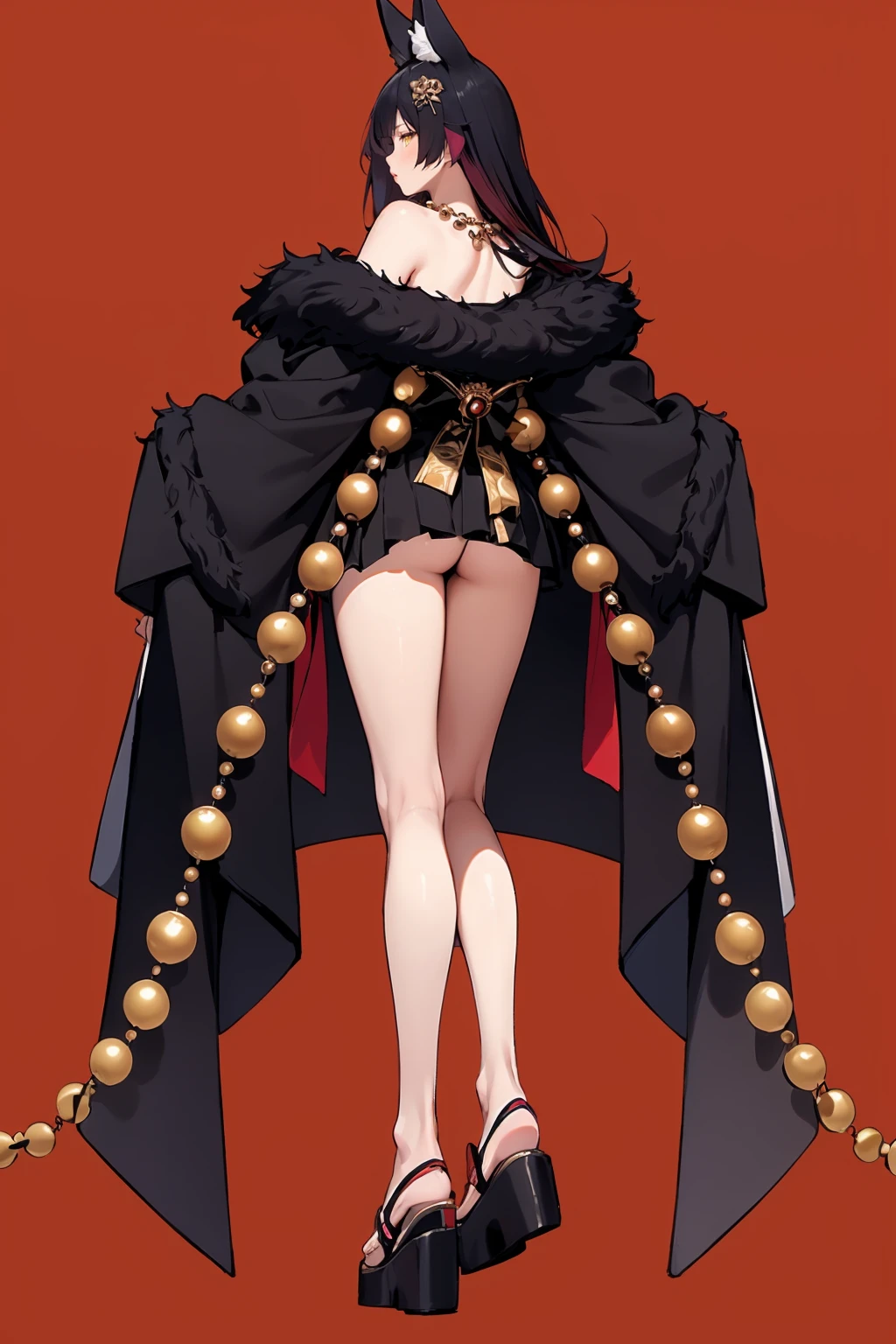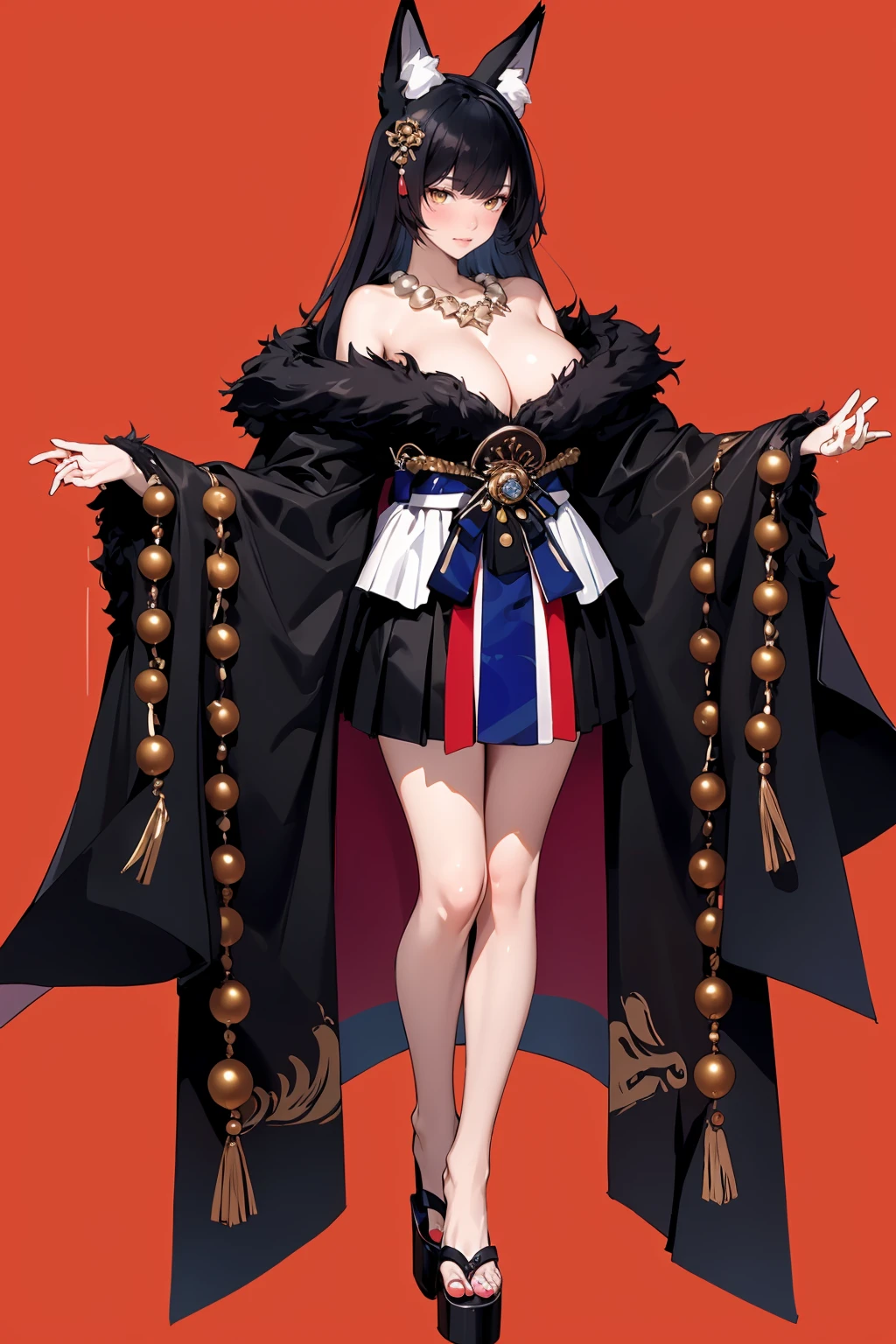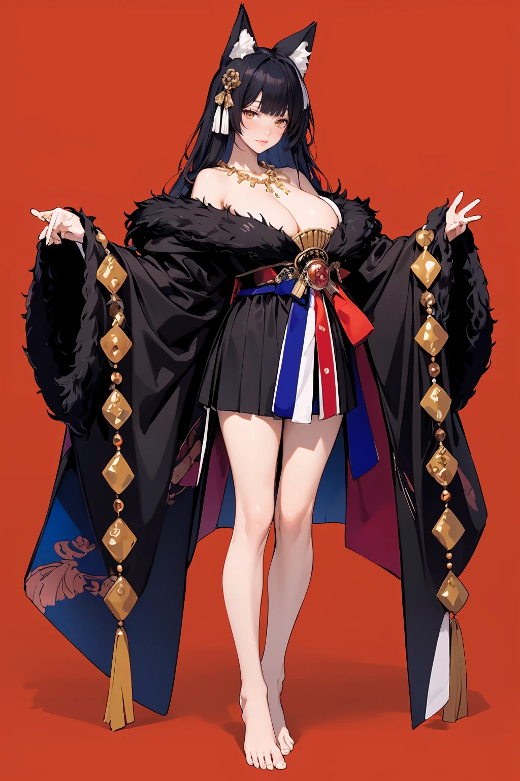 black kimono,black skirt,fur trim,fur-trimmed kimono,low neckline,short kimono,wide sleeves,magatama,long sleeves,