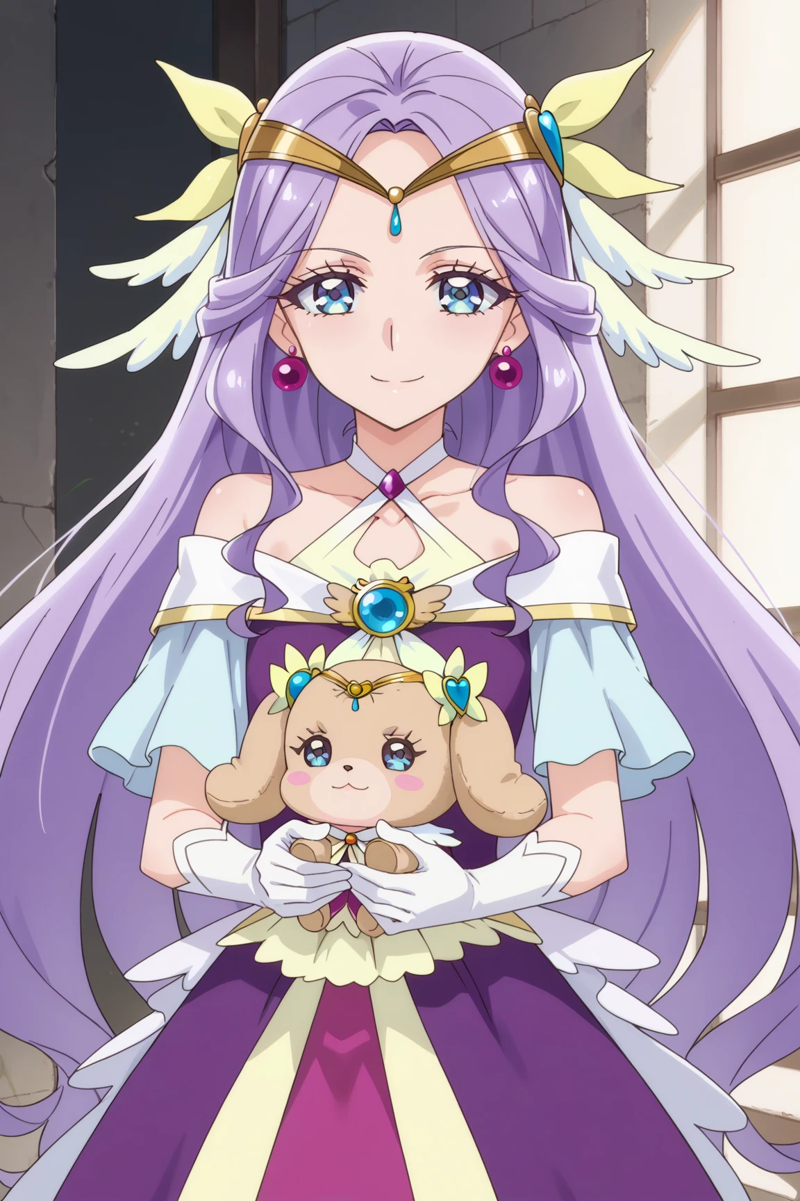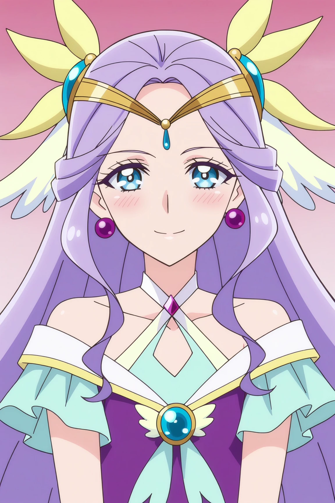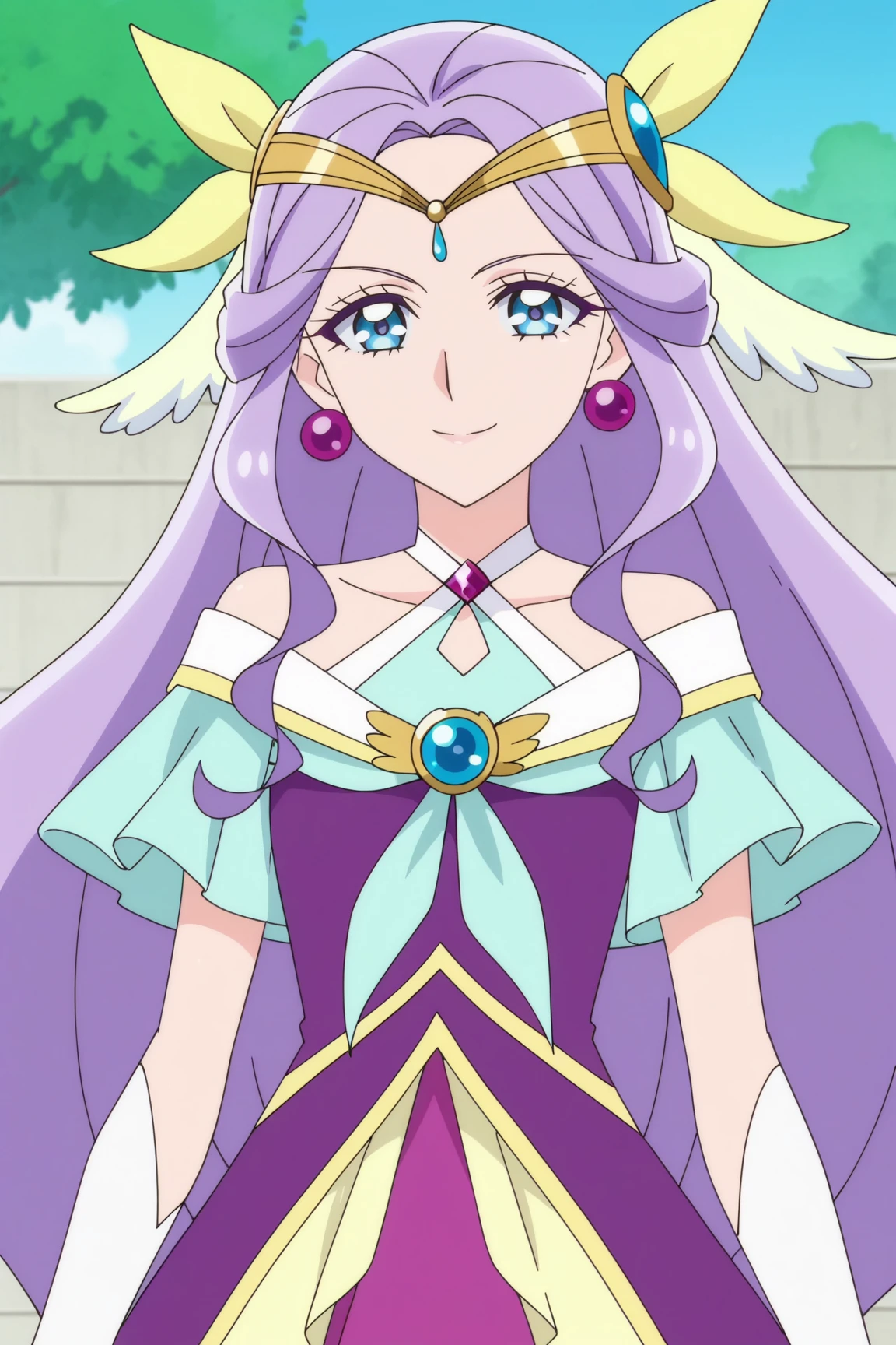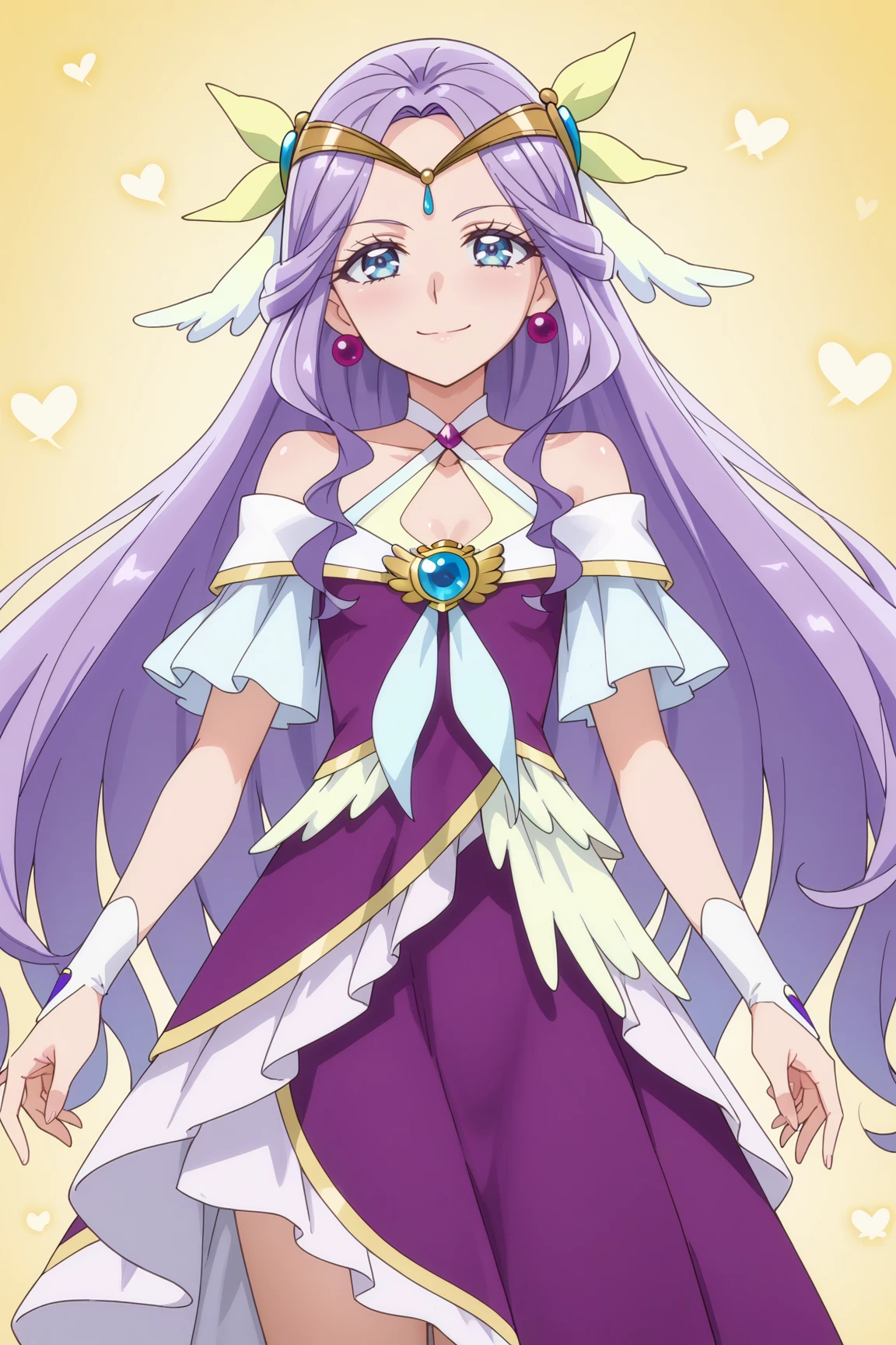 1girl, cure earth, healin' good precure, blue eyes, long hair, purple hair, magical girl, purple dress, circlet, hair ornament, earrings, collarbone,